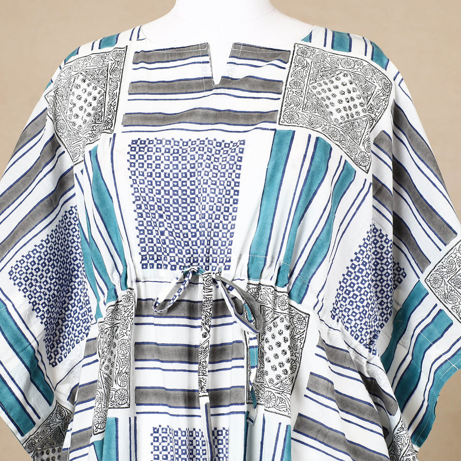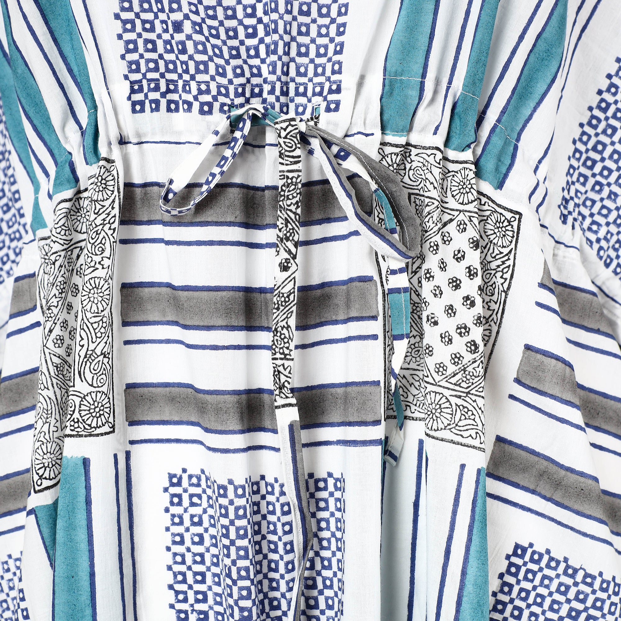 Fine quality hand block printed cotton long kaftan. A traditional kaftan or caftan is an ankle-length garment with long, flowing sleeves. It has an adjustable drawstring waist. These loose-fitting cotton kaftans are enhanced by a soft touch and beautiful hand prints. This dress will allow you to move with ease and comfort. The drawstring waist tie will give you the freedom to customize the fit to suit your unique shape.