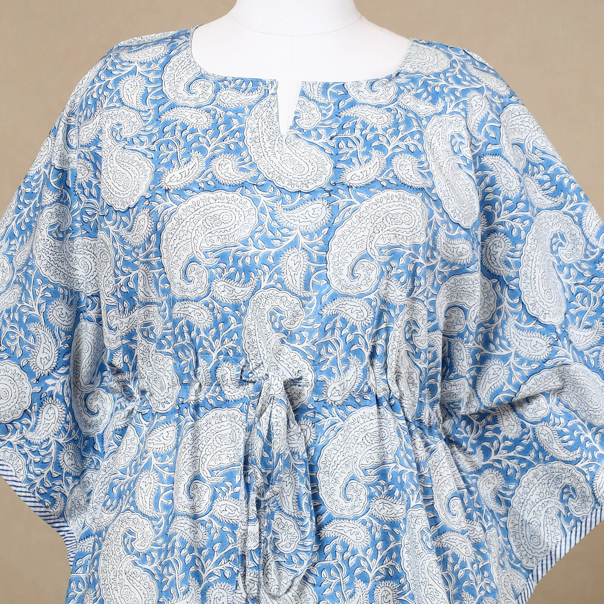 Fine quality hand block printed cotton short kaftan. A traditional kaftan or caftan is an short length garment with long, flowing sleeves. It has an adjustable drawstring waist. These loose-fitting cotton kaftans are enhanced by a soft touch and beautiful hand prints. This dress will allow you to move with ease and comfort. The drawstring waist tie will give you the freedom to customize the fit to suit your unique shape.