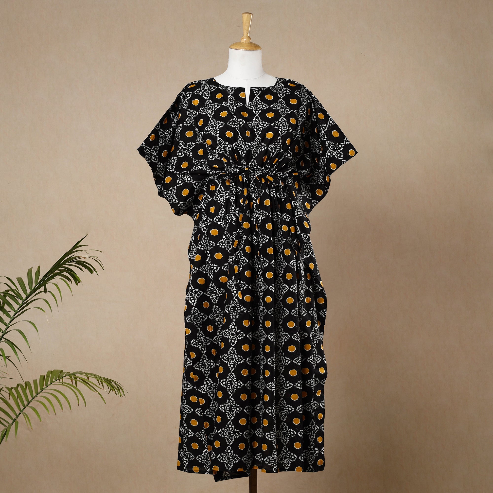 Fine quality hand block printed cotton long kaftan. A traditional kaftan or caftan is an ankle-length garment with long, flowing sleeves. It has an adjustable drawstring waist. These loose-fitting cotton kaftans are enhanced by a soft touch and beautiful hand prints. This dress will allow you to move with ease and comfort. The drawstring waist tie will give you the freedom to customize the fit to suit your unique shape.