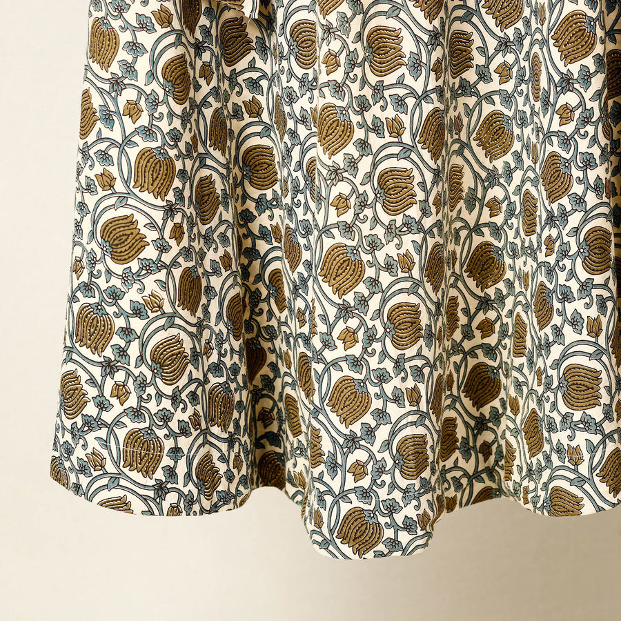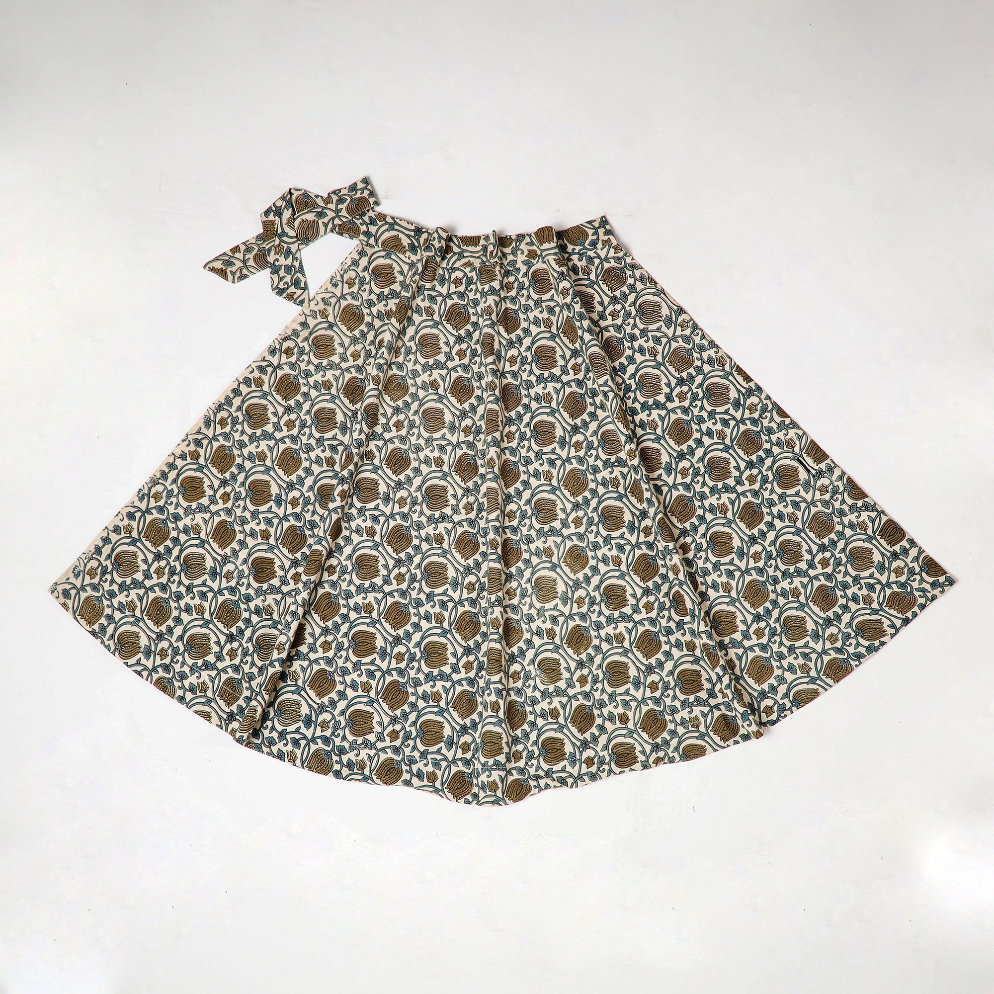 Fine quality brown ajrakh hand block printed cotton wrap around skirt featuring a waist tie up closure, made using natural dyes through traditional ajrakh technique of hand-block printing practised by the master artisans in Kutch region of Gujarat.
