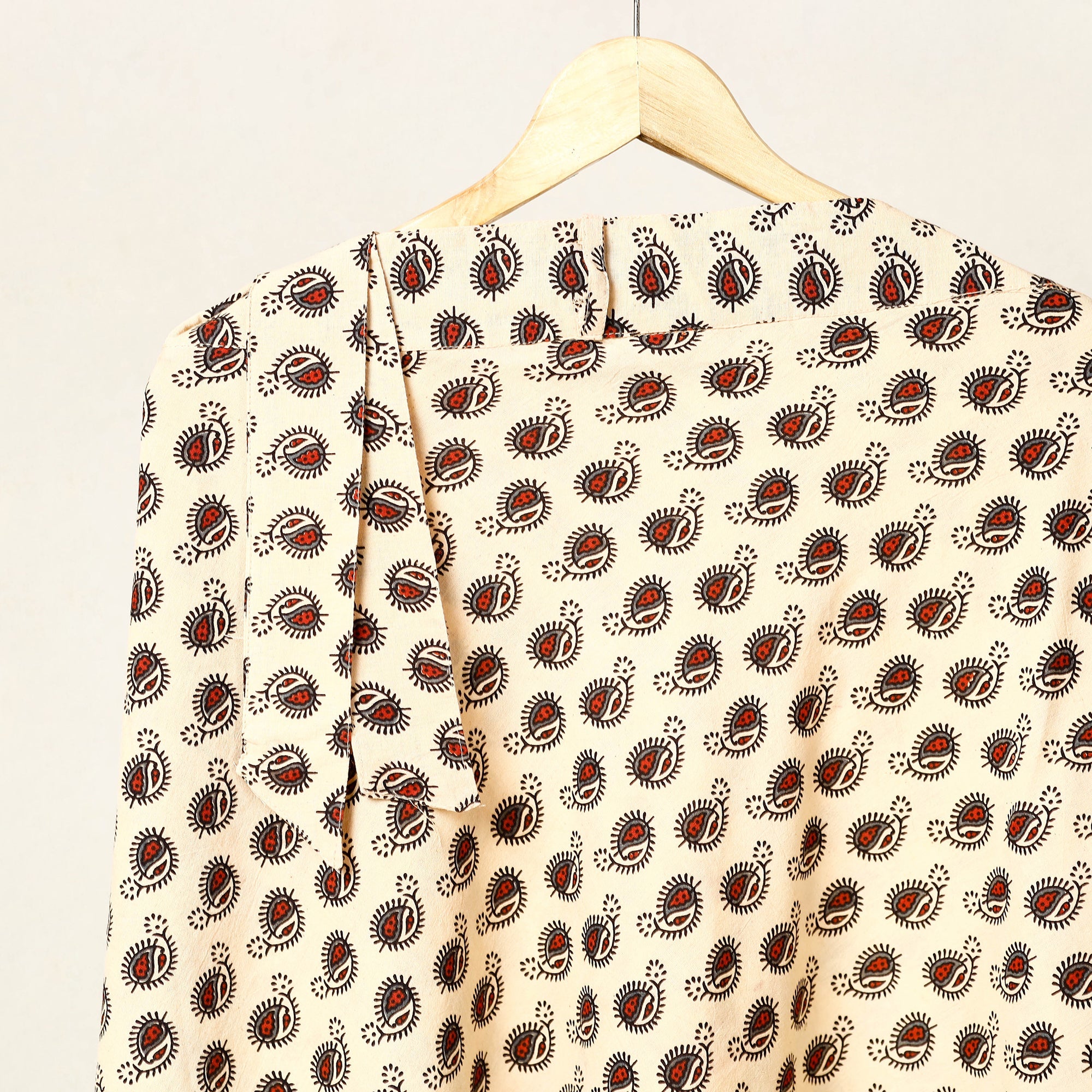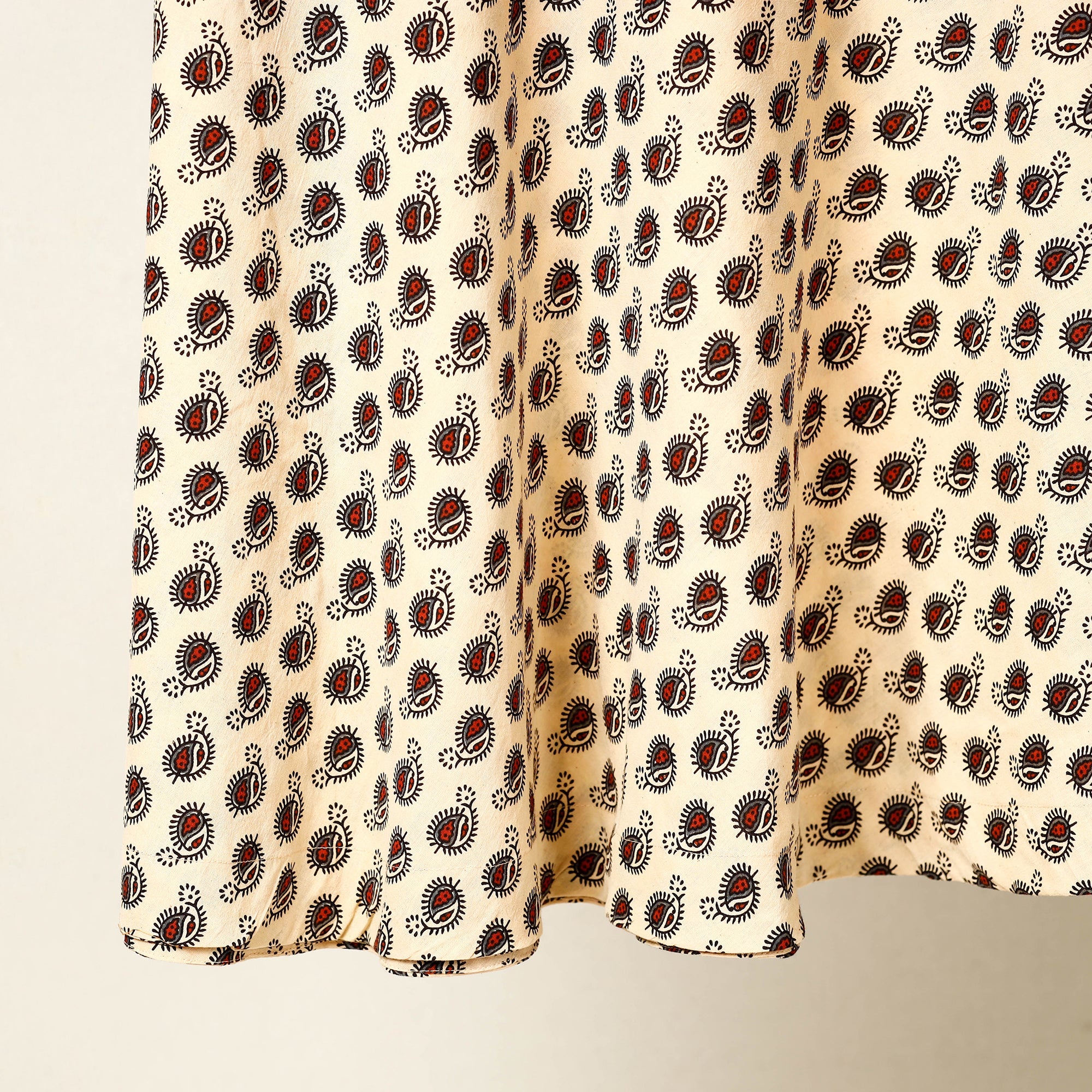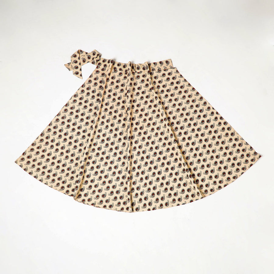 Fine quality beige ajrakh hand block printed cotton wrap around skirt featuring a waist tie up closure, made using natural dyes through traditional ajrakh technique of hand-block printing practised by the master artisans in Kutch region of Gujarat.