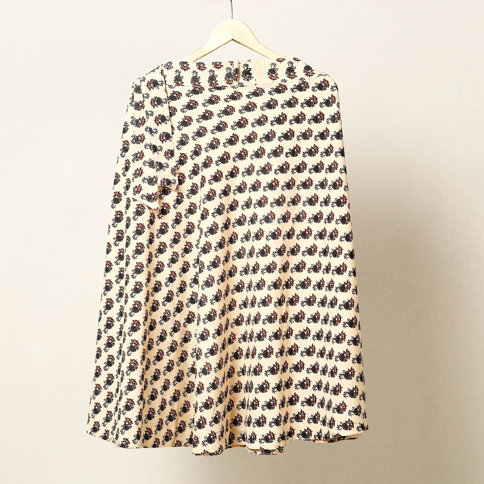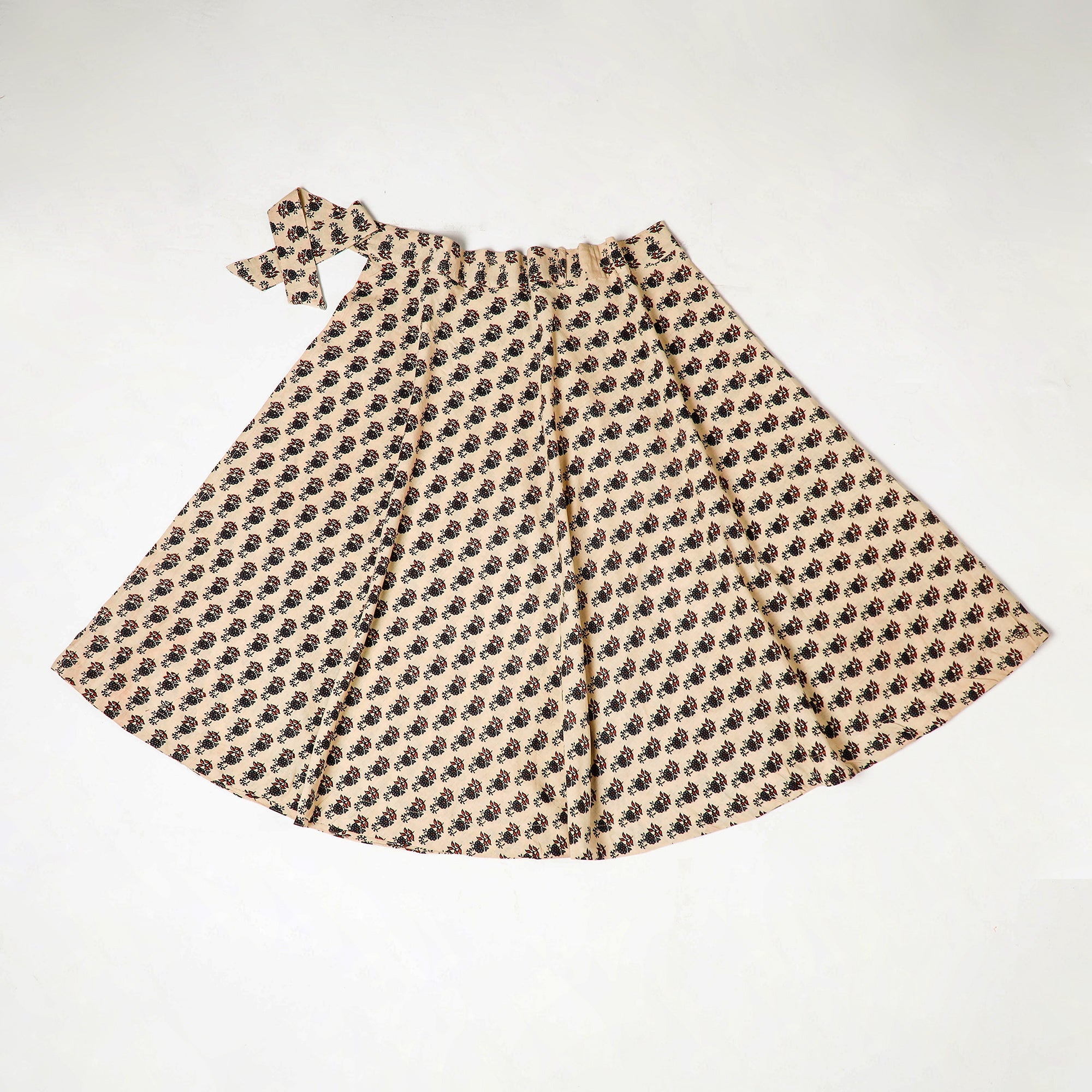 Enhance your wardrobe with our beige block print cotton wrap around ajrakh skirt, handcrafted by skilled artisans in the Kutch region of Gujarat. Featuring a wrap-around style with a waist tie closure, this skirt is made using eco-friendly natural dyes and traditional Ajrakh block printing techniques. Its breathable cotton fabric ensures comfort, perfect for casual outings.