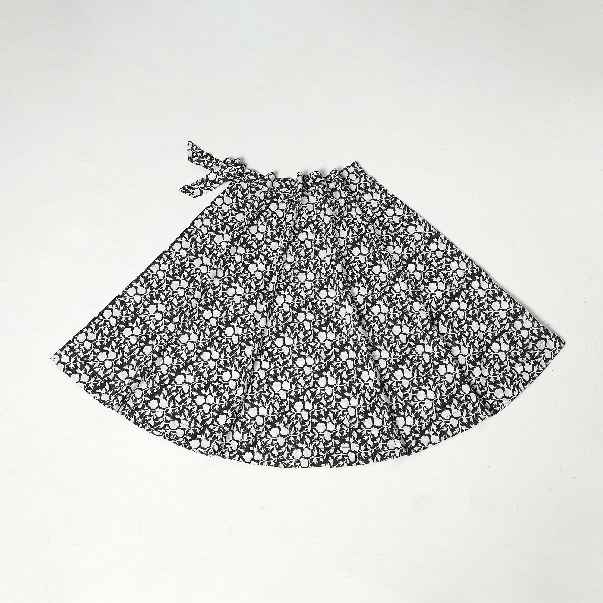 Fine quality black sanganeri hand block print cotton wrap around skirt featuring a waist tie up closure. Sanganeri is a hand-block printing technique originating from Sanganer, a village in the southern part of Jaipur, Rajasthan. Bleed free VAT dyes used.