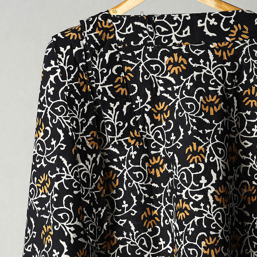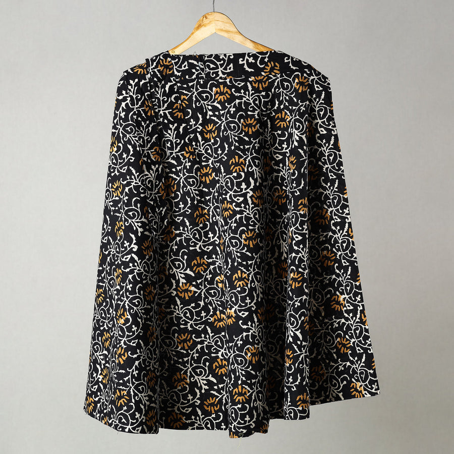 Fine quality black sanganeri hand block print cotton wrap around skirt featuring a waist tie up closure. Sanganeri is a hand-block printing technique originating from Sanganer, a village in the southern part of Jaipur, Rajasthan. Bleed free VAT dyes used.