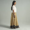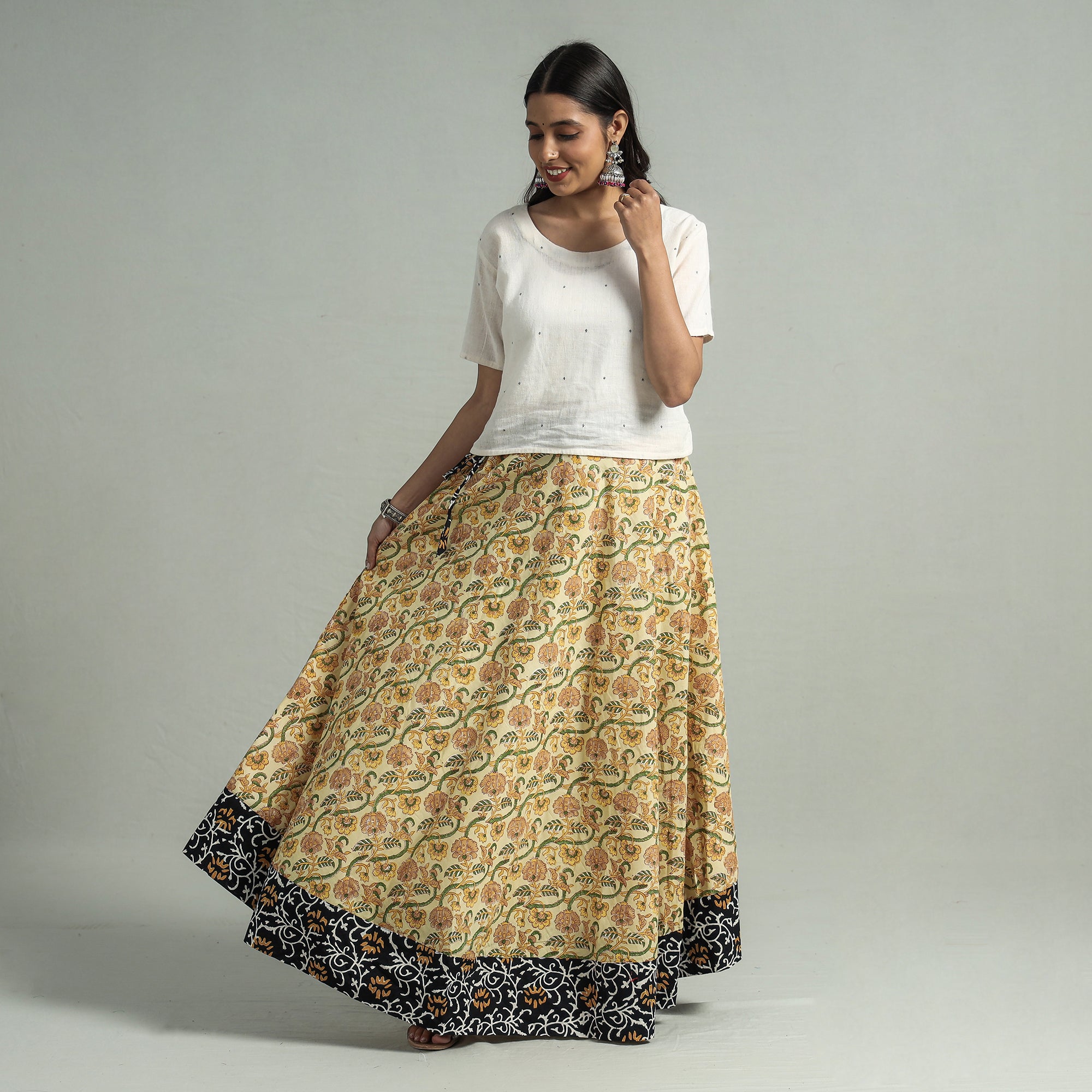 Fine quality yellow sanganeri hand block print cotton long skirt featuring a waist tie up closure. Sanganeri is a hand-block printing technique originating from Sanganer, a village in the southern part of Jaipur, Rajasthan. Bleed free VAT dyes used.