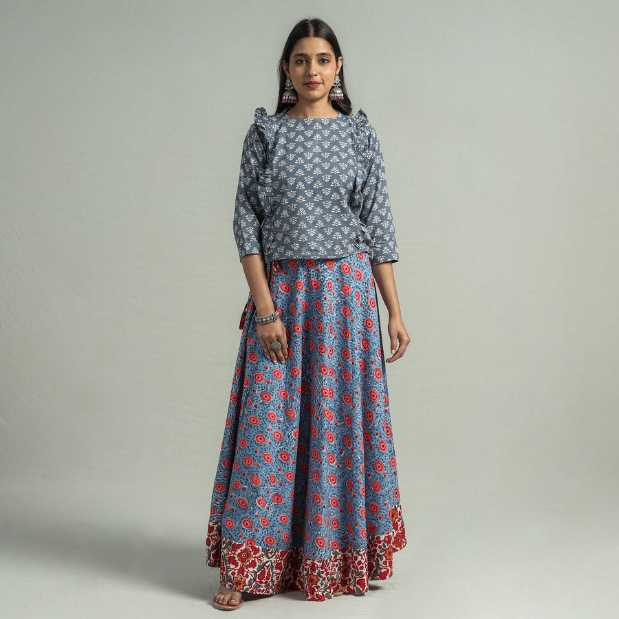 Fine quality blue sanganeri hand block print cotton long skirt featuring a waist tie up closure. Sanganeri is a hand-block printing technique originating from Sanganer, a village in the southern part of Jaipur, Rajasthan. Bleed free VAT dyes used.