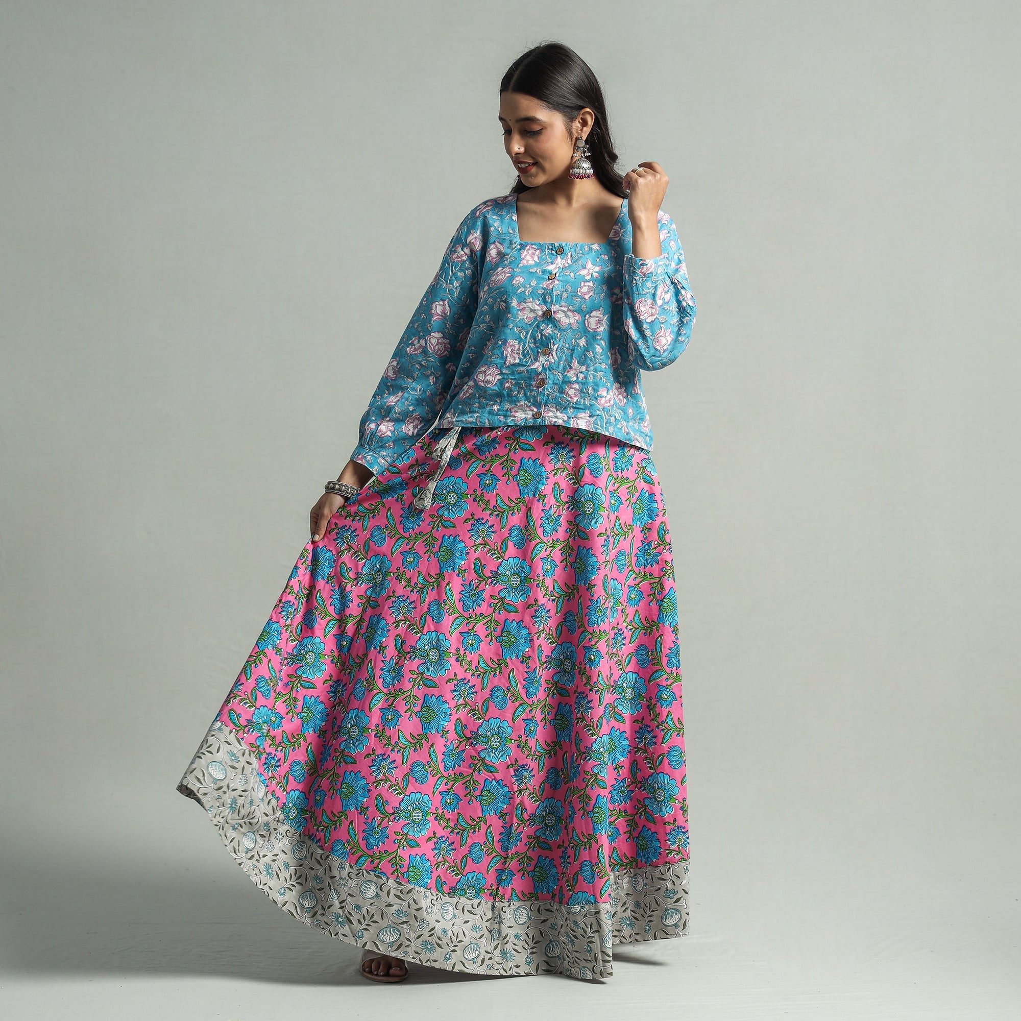 Fine quality pink sanganeri hand block print cotton long skirt featuring a waist tie up closure. Sanganeri is a hand-block printing technique originating from Sanganer, a village in the southern part of Jaipur, Rajasthan. Bleed free VAT dyes used.