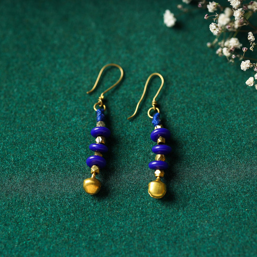 Blue handcrafted brass metal alloy dokra beads & threadwork earrings handmade by tribes. Dokra system of metal casting is said to be the oldest form of metal casting and is technically known as ‘cire perdue’ or lost wax process. The technique of casting revolves round replacement of wax with molten metal by the traditional hollow casting method. Very intense process of Dhokra casting is currently practiced in tribal areas of India mostly around Chhattisgarh and Orissa.