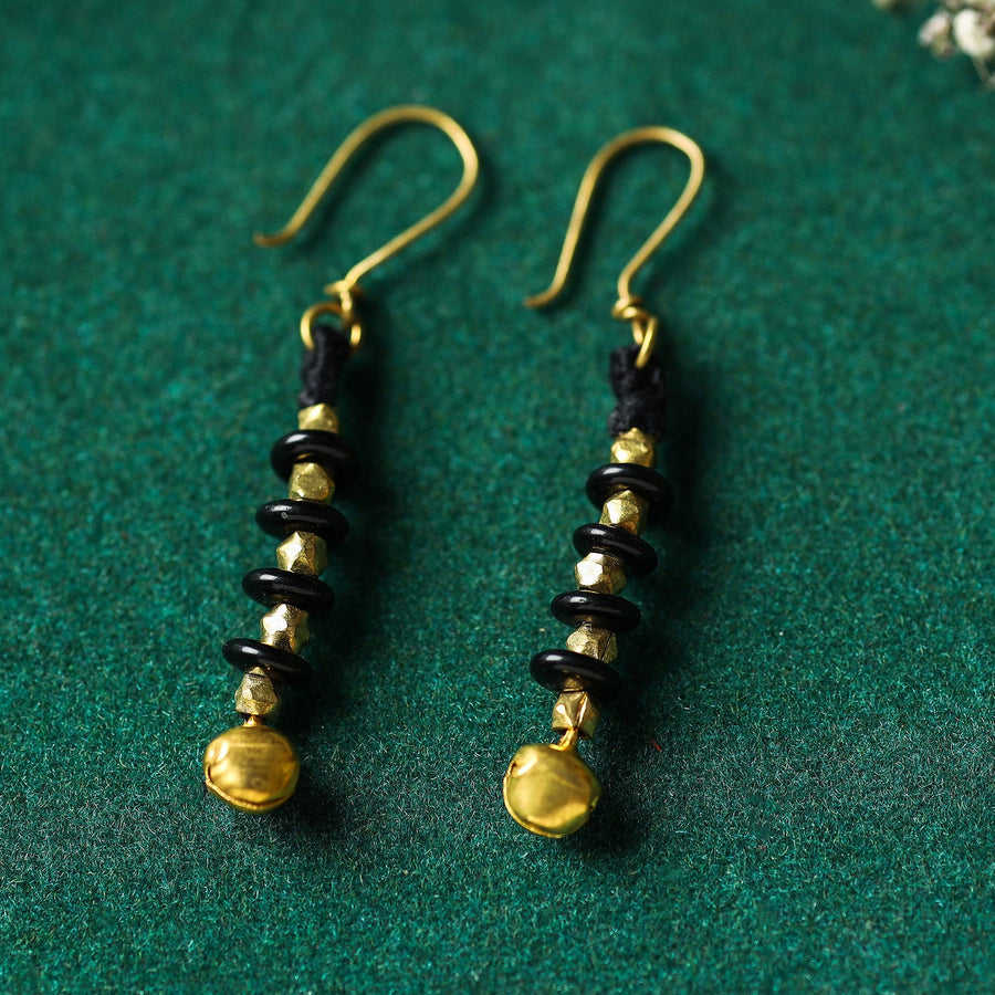 Black handcrafted brass metal alloy dokra beads & threadwork earrings handmade by tribes. Dokra system of metal casting is said to be the oldest form of metal casting and is technically known as ‘cire perdue’ or lost wax process. The technique of casting revolves round replacement of wax with molten metal by the traditional hollow casting method. Very intense process of Dhokra casting is currently practiced in tribal areas of India mostly around Chhattisgarh and Orissa.