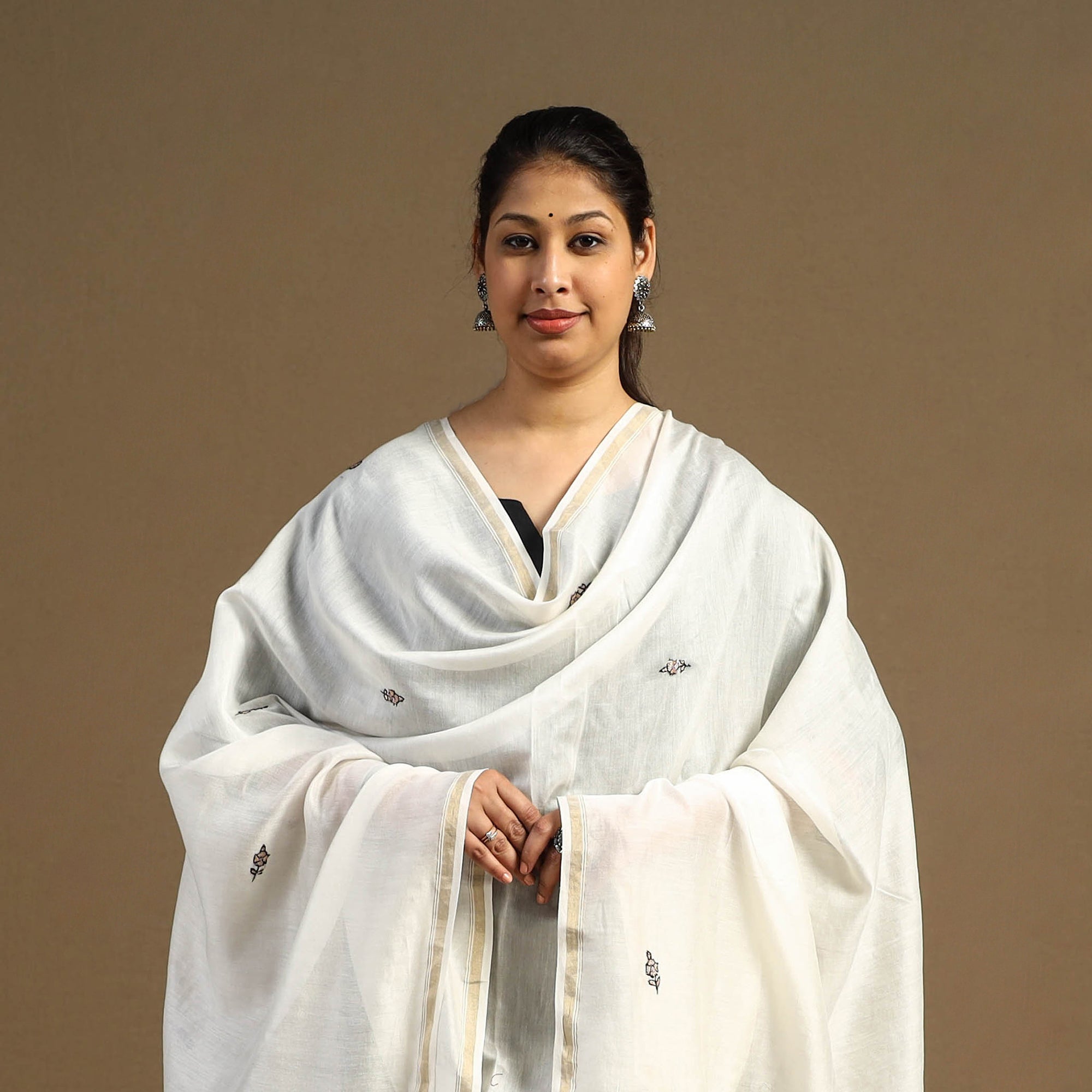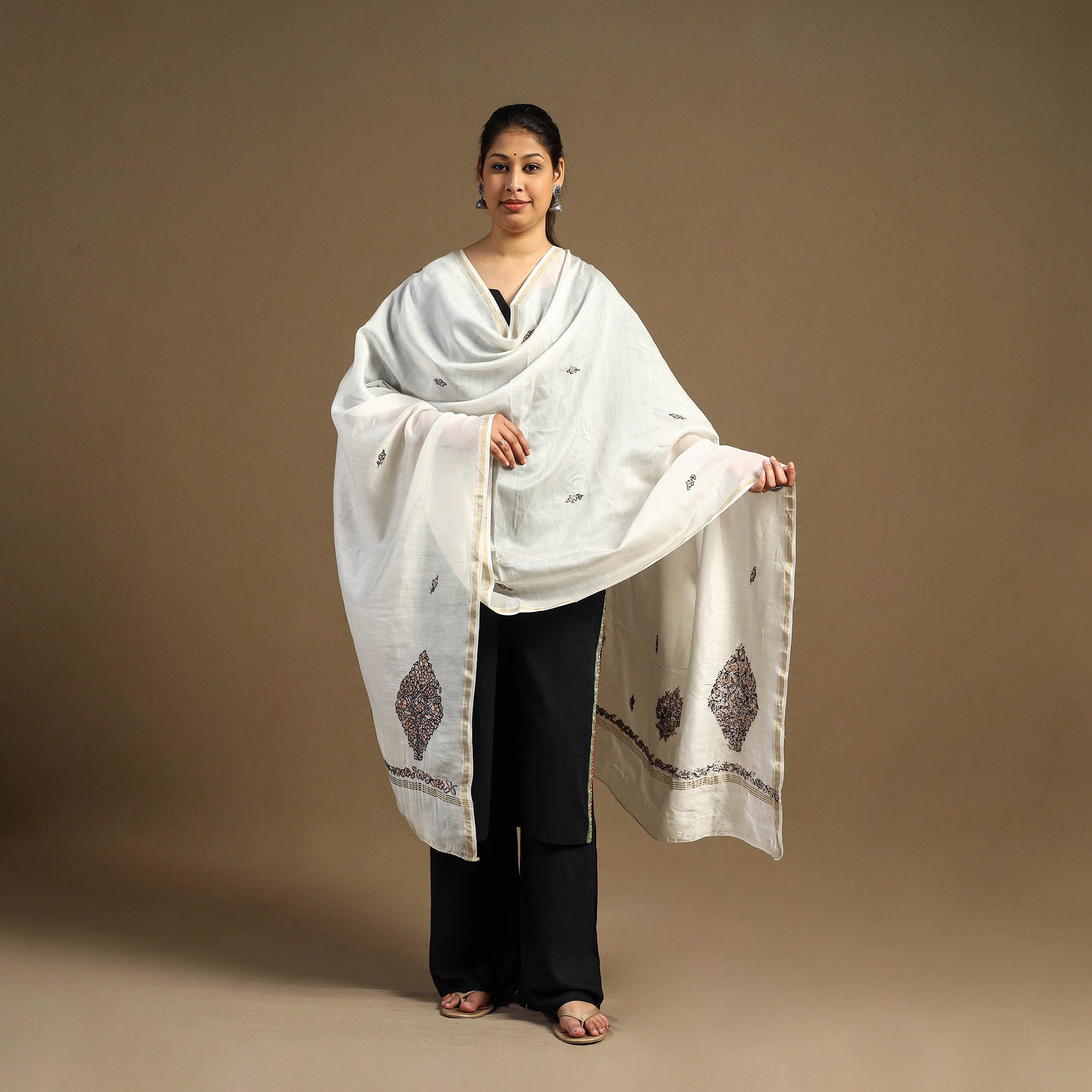 White - Handloom Chanderi Silk Kashida Embroidery Dupatta 03