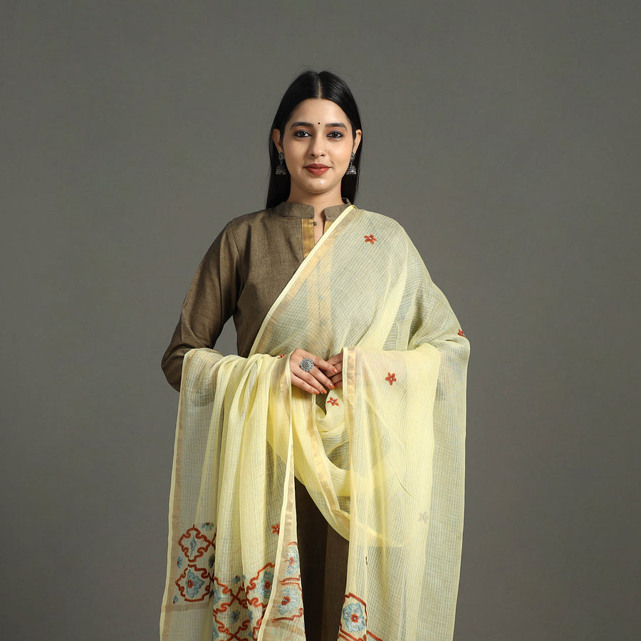 Fine yellow kashida thread work hand embroidered handloom kota silk dupatta by Zahoor Ahmed from Harwan, Kashmir.