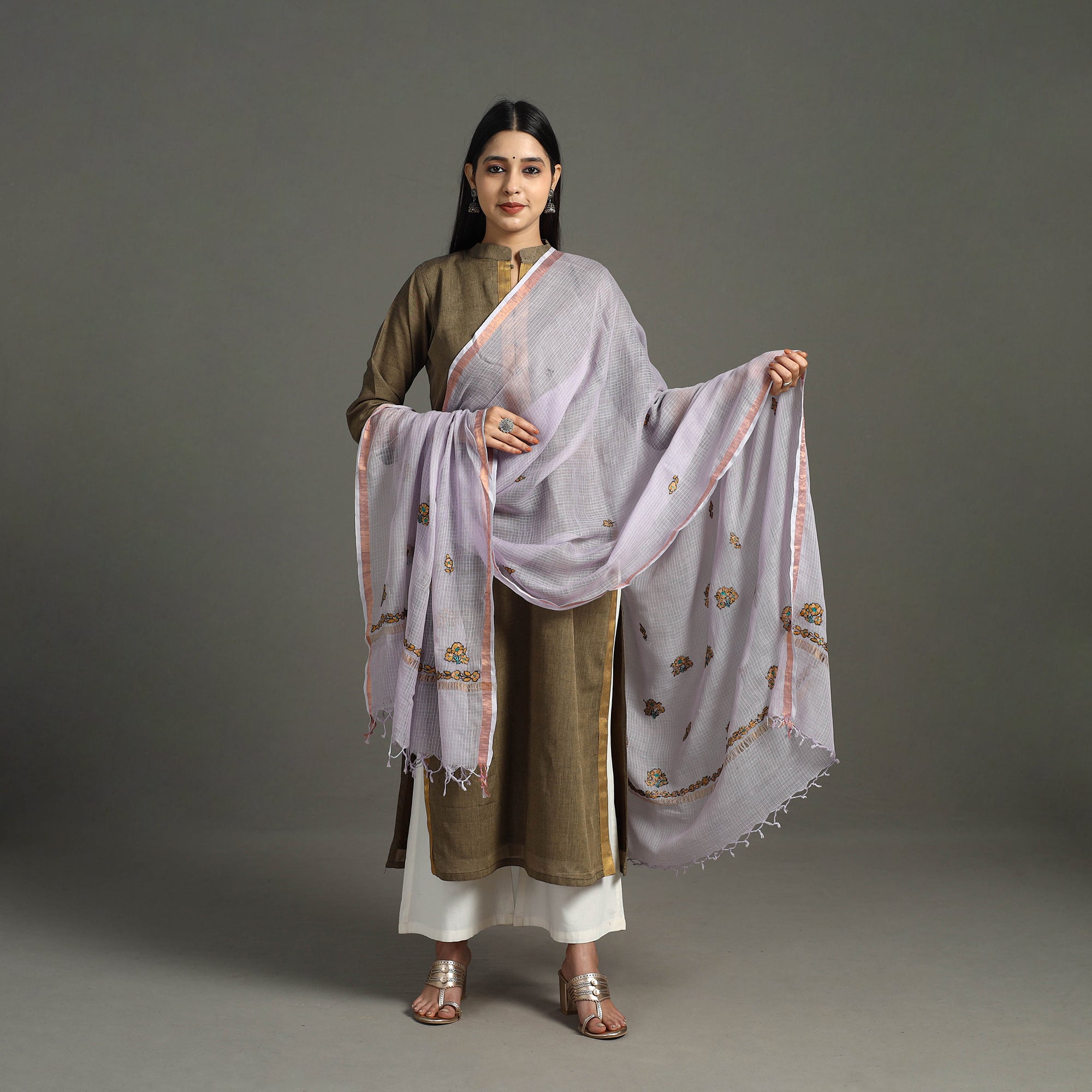 Fine purple kashida thread work hand embroidered handloom kota silk dupatta by Zahoor Ahmed from Harwan, Kashmir.