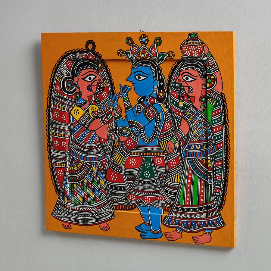 Traditional madhubani handpainted motifs with fabric colors on wooden board decorative item by master artisan Hira Devi from Bihar.