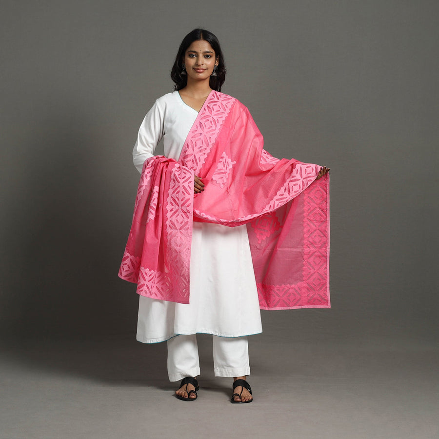 Fine quality hand-stitched traditional pink barmer cutwork cotton applique dupatta. Its unique style applique work does magic in light and shade with beautiful stories and patterns. This famous applique cut work is done by the artisans of Barmer, Rajasthan.