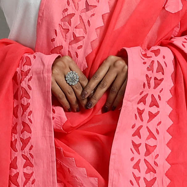 Fine quality hand-stitched traditional red barmer cutwork cotton applique dupatta. Its unique style applique work does magic in light and shade with beautiful stories and patterns. This famous applique cut work is done by the artisans of Barmer, Rajasthan.