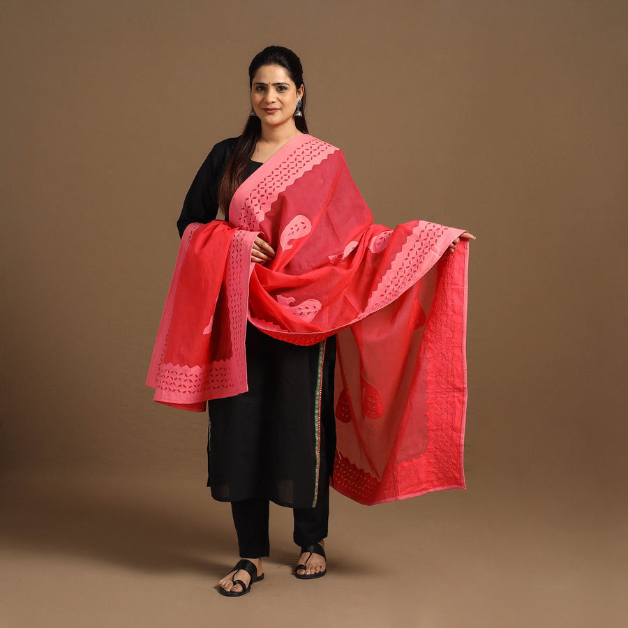 | Material | Fine quality red hand-stitched traditional applique cut work cotton dupatta. Its unique style applique work does magic in light and shade with beautiful stories and patterns. This famous applique cut work is done by the artisans of Barmer, Rajasthan. |