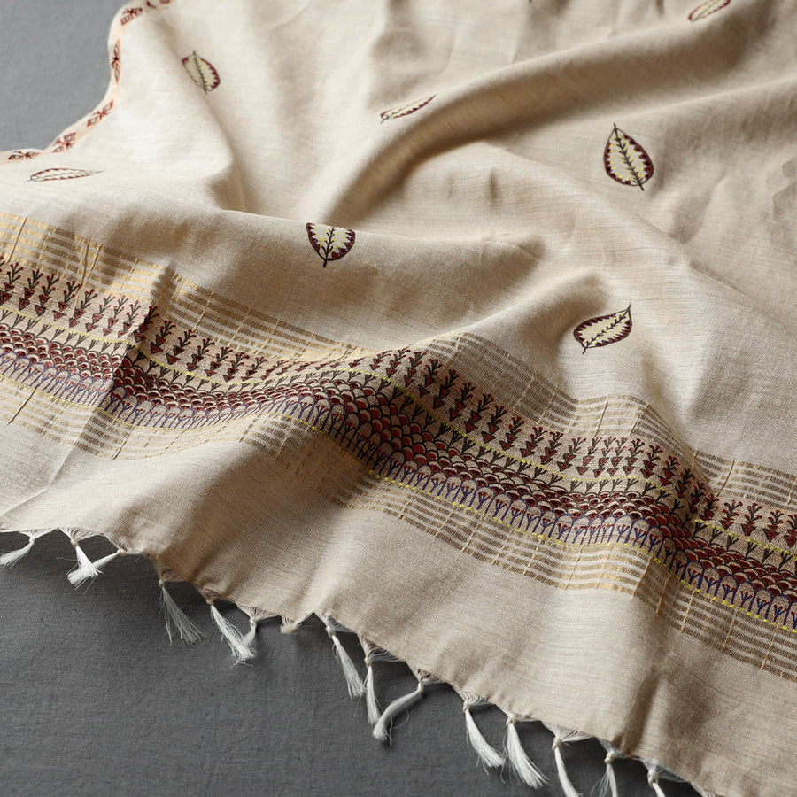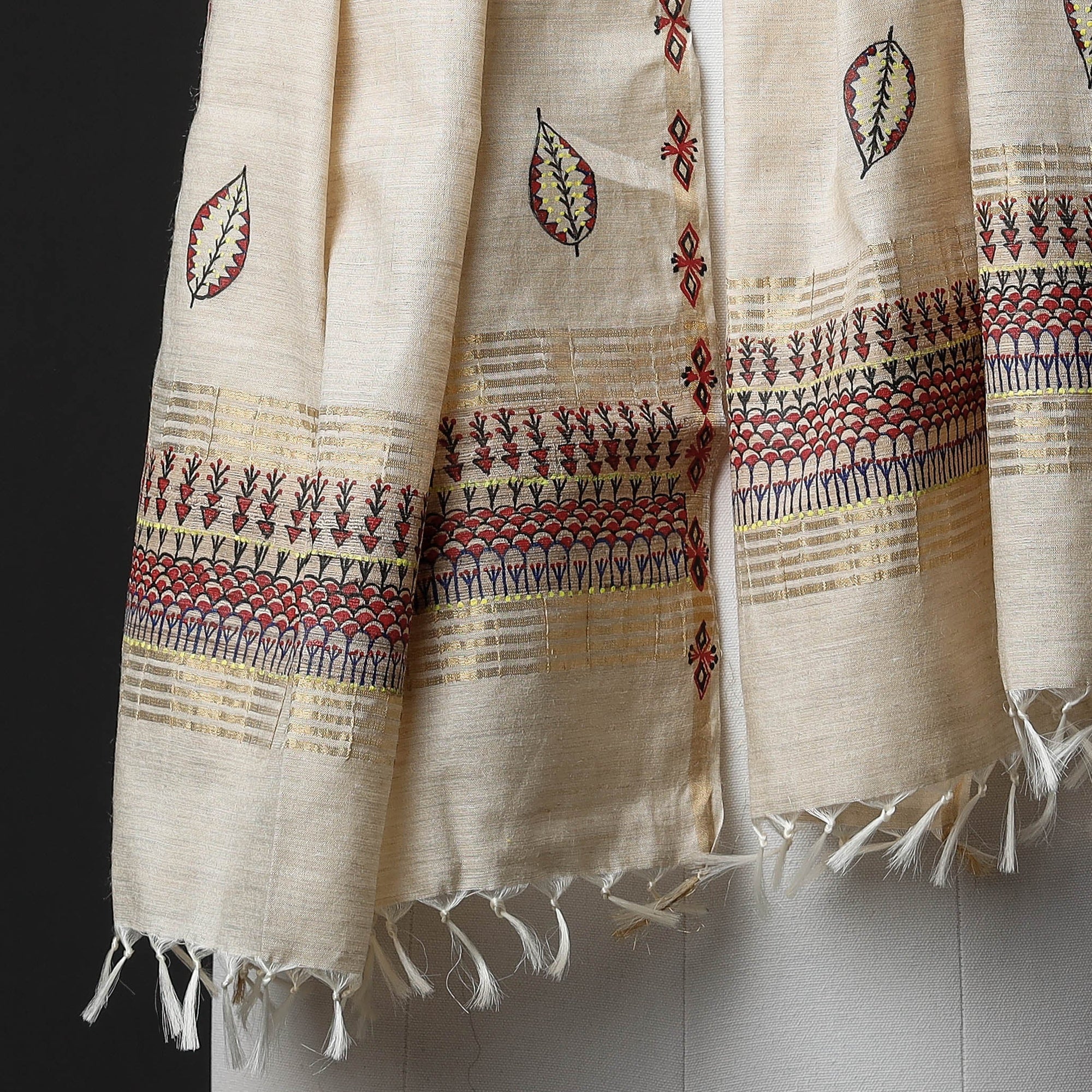 Fine quality traditional godana handpainted spun silk handloom stole, made by master artisans of Chhattisgarh. Godana is craft of hand painting done with natural color on fabric and other solid base. Godana paintings are inspired from everyday life of villages in India. It is a traditional art form of Sarguja, Chhattisgarh. The new version of godana is actually a transformation of godana (Traditional Tattoo) done on the body in Chhattisgarh region of India.