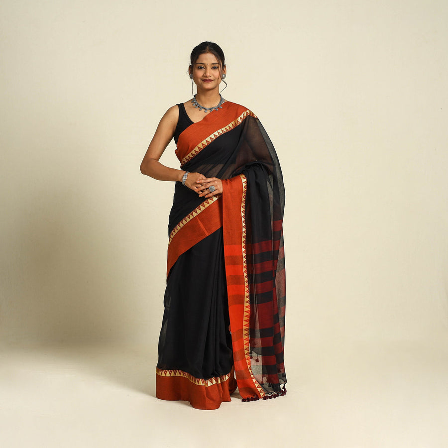 Fine quality Bengal border black pure handloom cotton saree. The handloom experience (soft, comfortable and durable) is due to the human handling of the yarn in the weaving process. As a result, yarn and the fabric are much less stressed and damaged. Hand woven cotton is known for its breathability as compared to mill made cotton. This implies that it allows more air penetration making it cooler, softer and more absorbent. It keeps you cooler in summers and warm in winters.