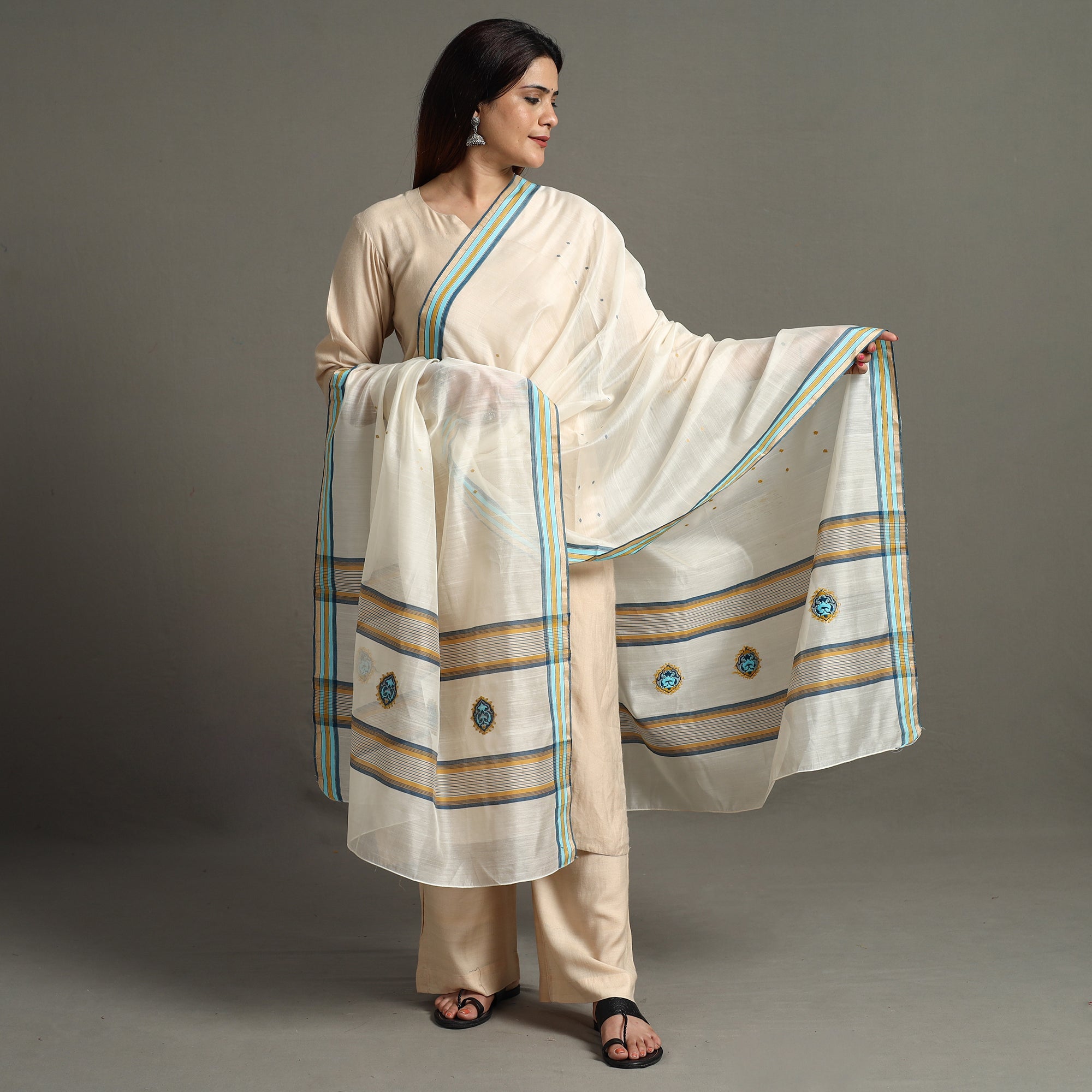 Fine quality traditional chanderi silk-cotton pure handloom dupatta with intricate zari weaving by master artisan Rauph Khan. Chanderi silks are known for its gossamer looks and amazing feel. Chanderi weaving is practiced in the historic town of Chanderi in Madhya Pradesh. The buttis or motifs on chanderi blend are primarily hand woven on handloom, with the use of needles. Separate needles are used to create different motifs.