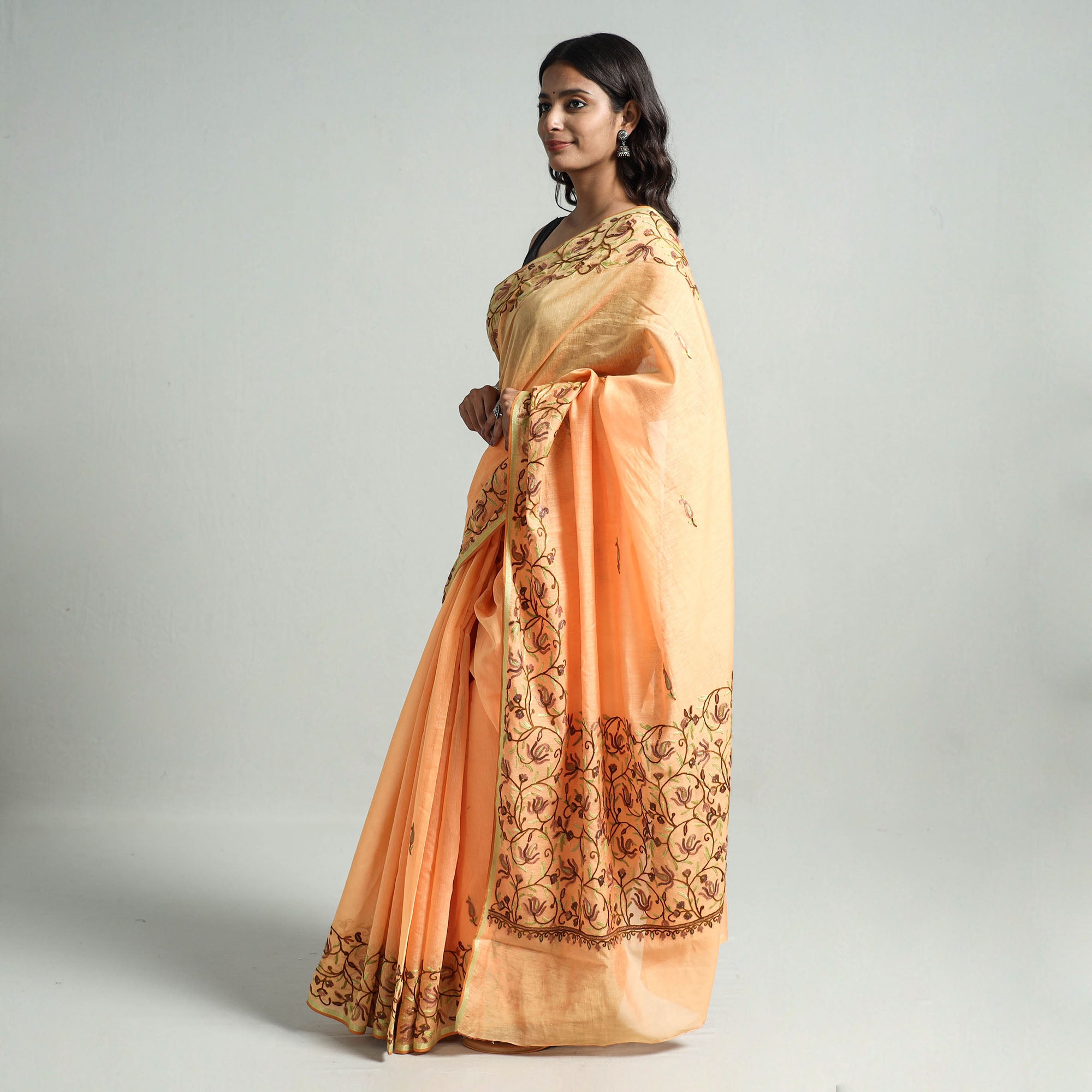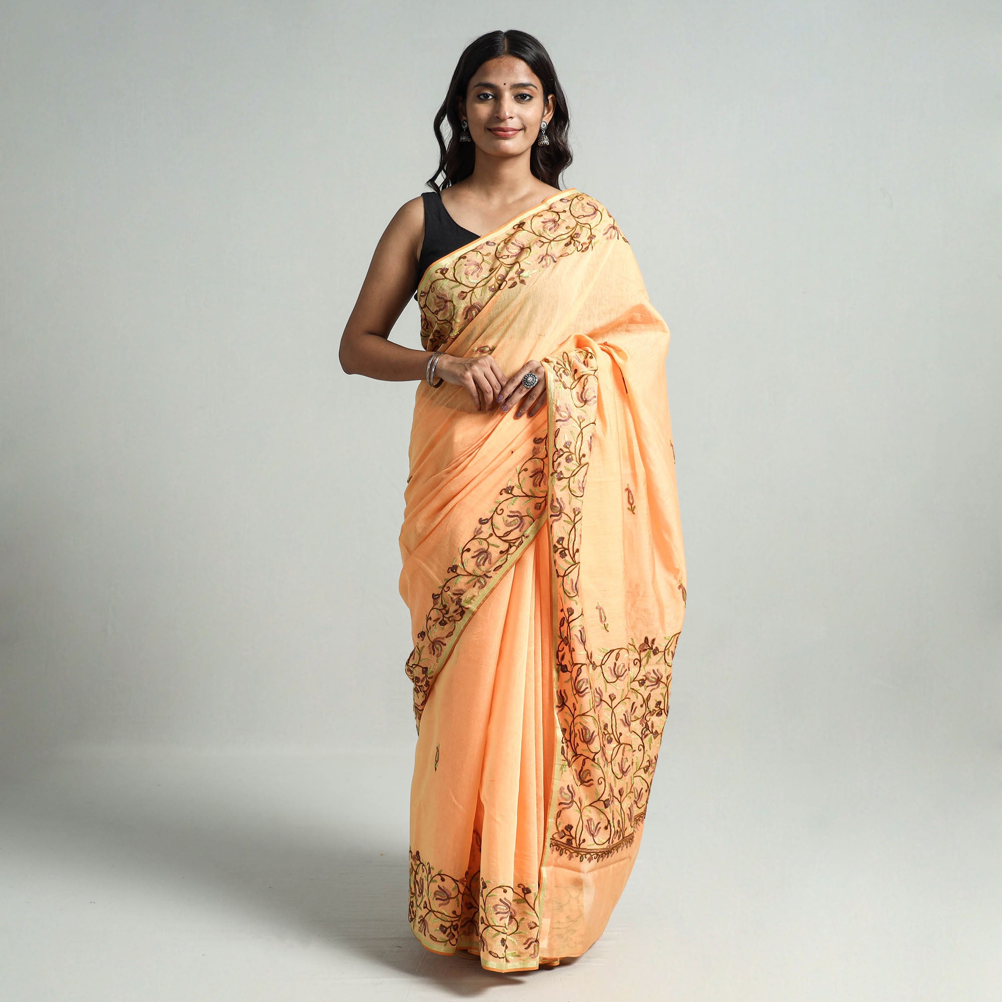 Fine quality peach kashida thread work hand embroideredhandloom chanderi silk-cotton block printed saree with zari border by Zahoor Ahmed from Harwan, Kashmir.