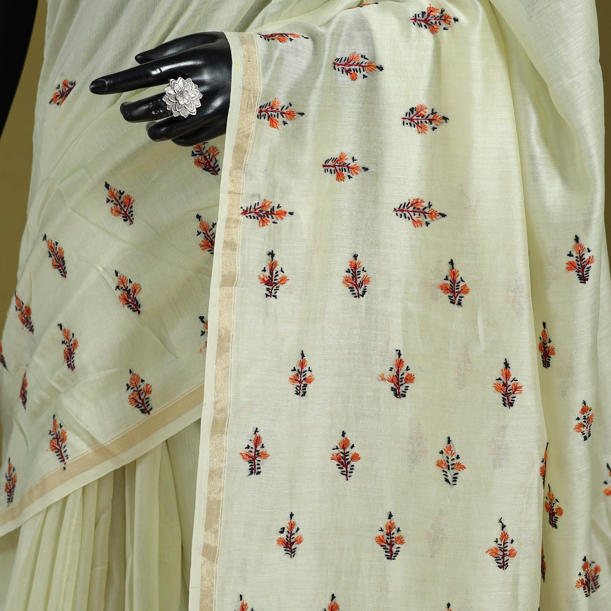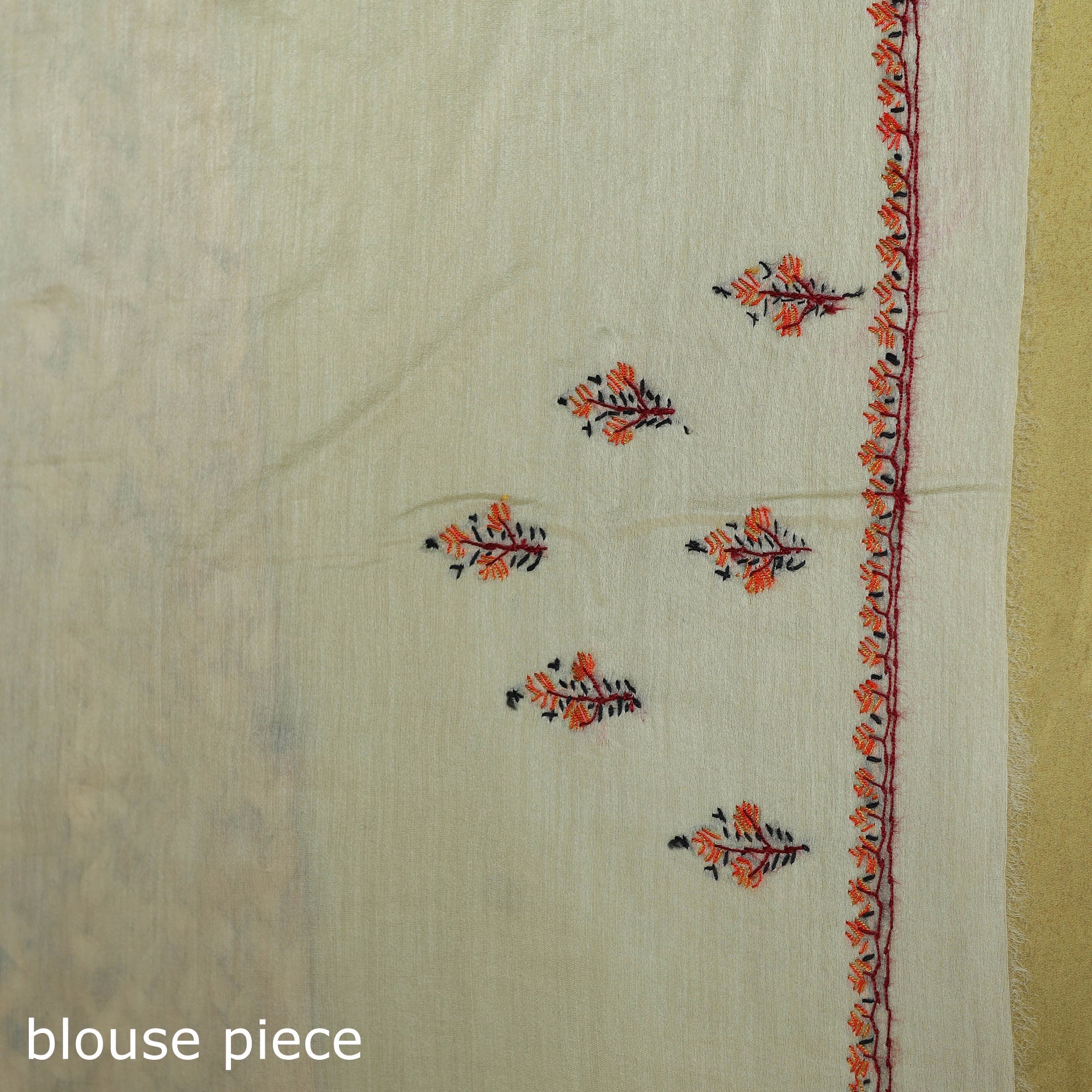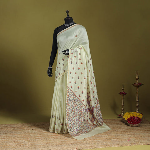 | Material | Fine quality yellow kashida thread work hand embroideredhandloom chanderi silk-cotton block printed saree with zari border by Zahoor Ahmed from Harwan, Kashmir. |