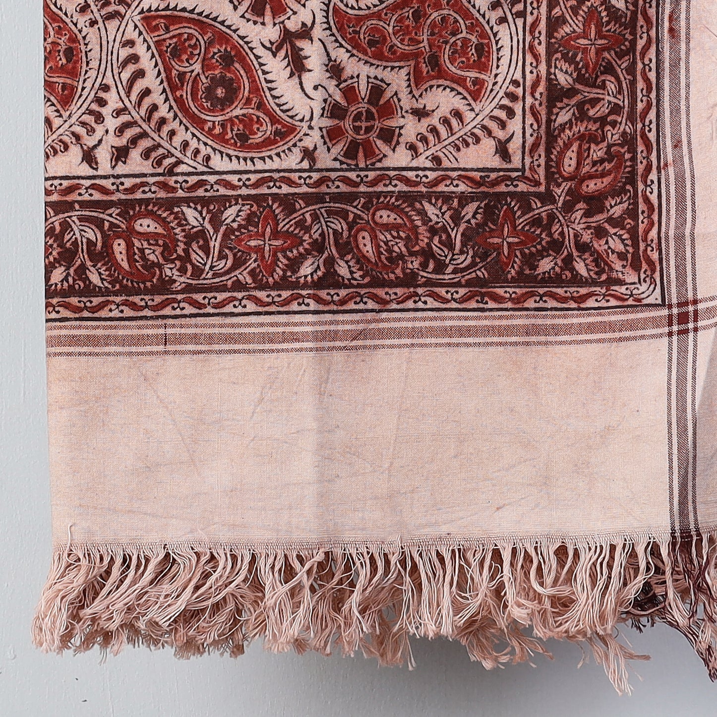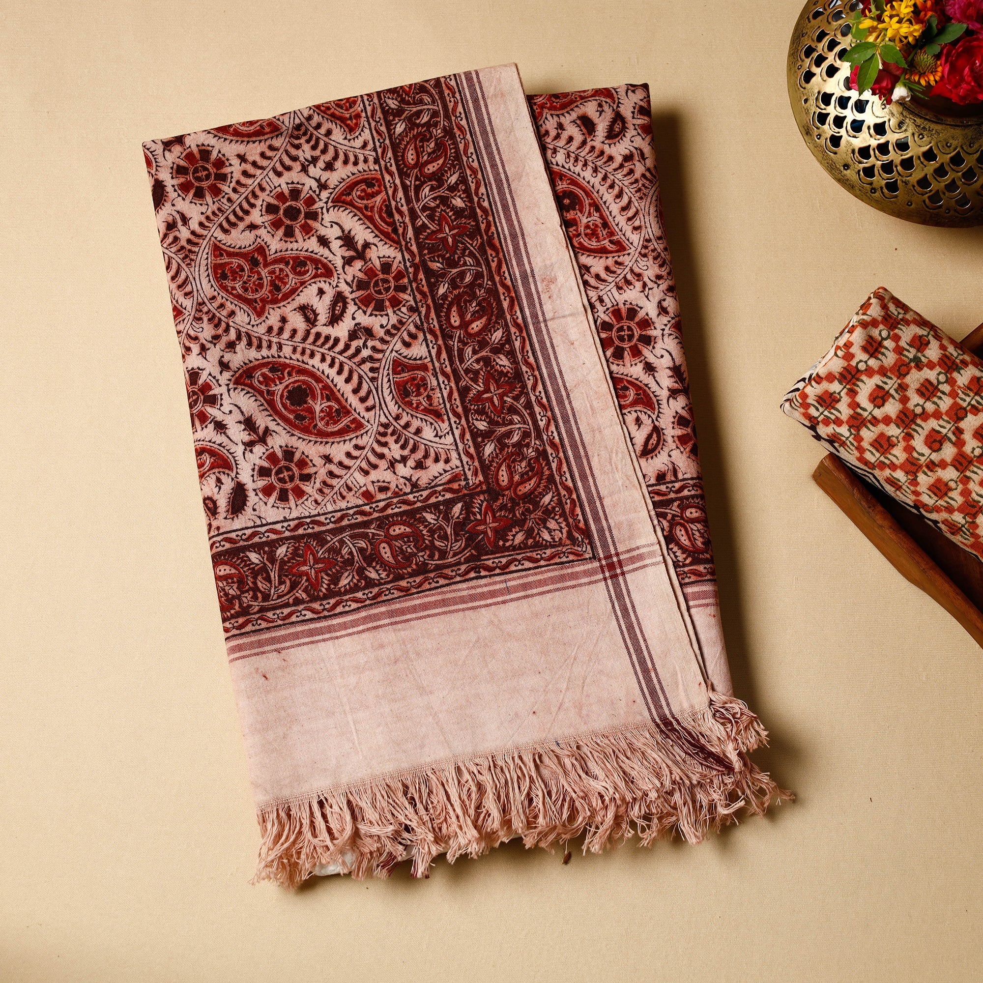 Fine quality original pedana kalamkari hand block printed natural dyed handloom pure cotton towel crafted by the skillful artisans of Pedana. Showcasing an assortment of hand block printed motifs inspired by traditional kalamkari painting. Kalamkari is the earliest and more complex techniques of block-printing.