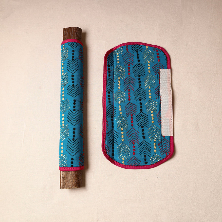 Fine quality blue Bengal kantha work handmade reversible fridge handle cover made from cotton fabric & foam. It is intricately designed with tiny running stitches in coloured thread using traditional craft technique of West Bengal .