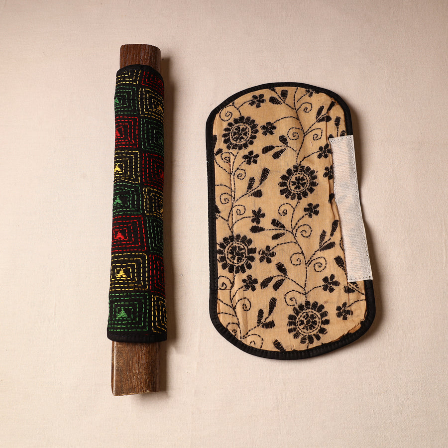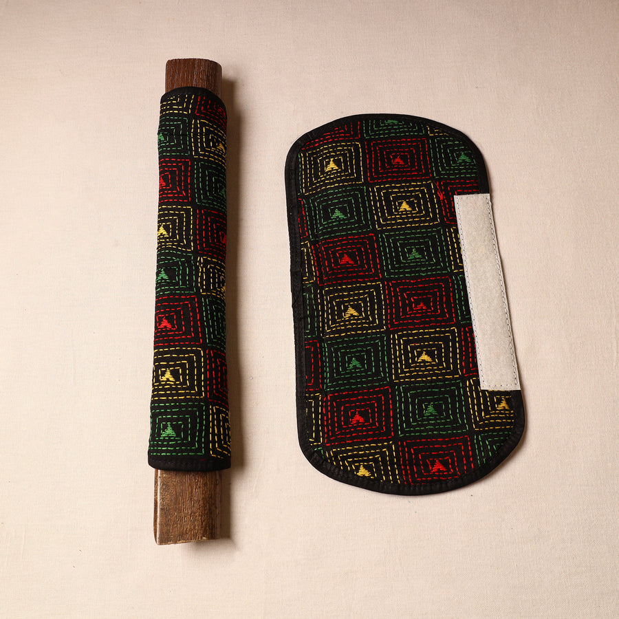 Fine quality Bengal kantha work handmade reversible fridge handle cover made from cotton fabric & foam. It is intricately designed with tiny running stitches in coloured thread using traditional craft technique of West Bengal .