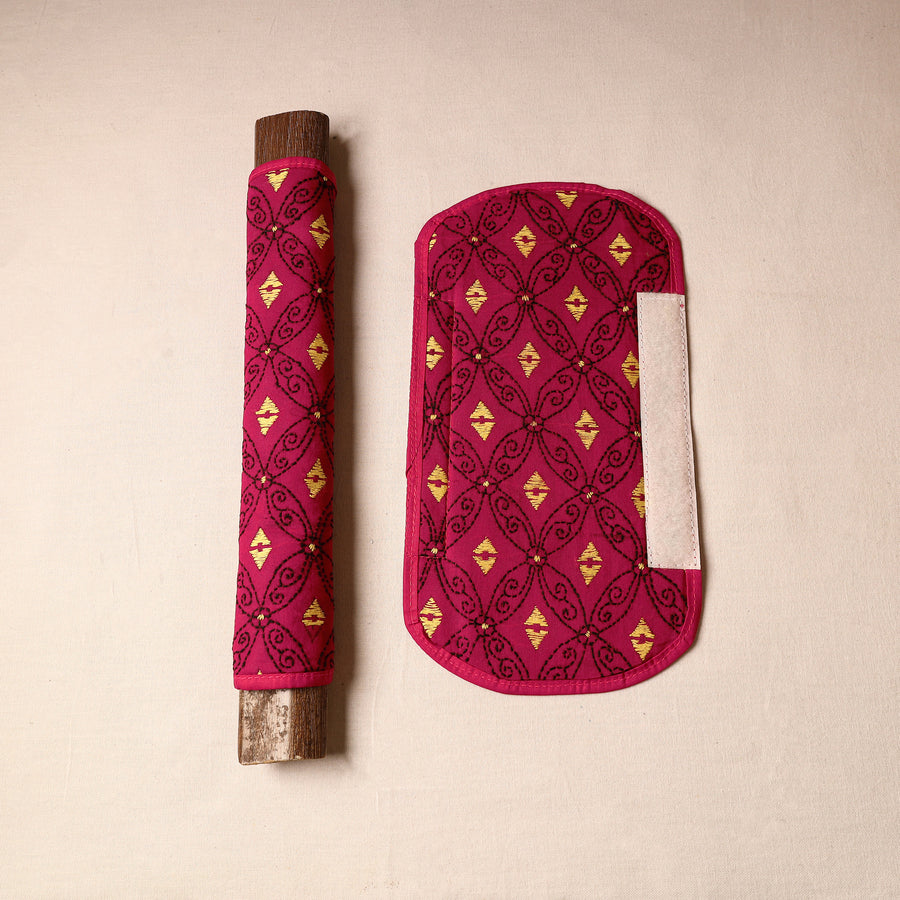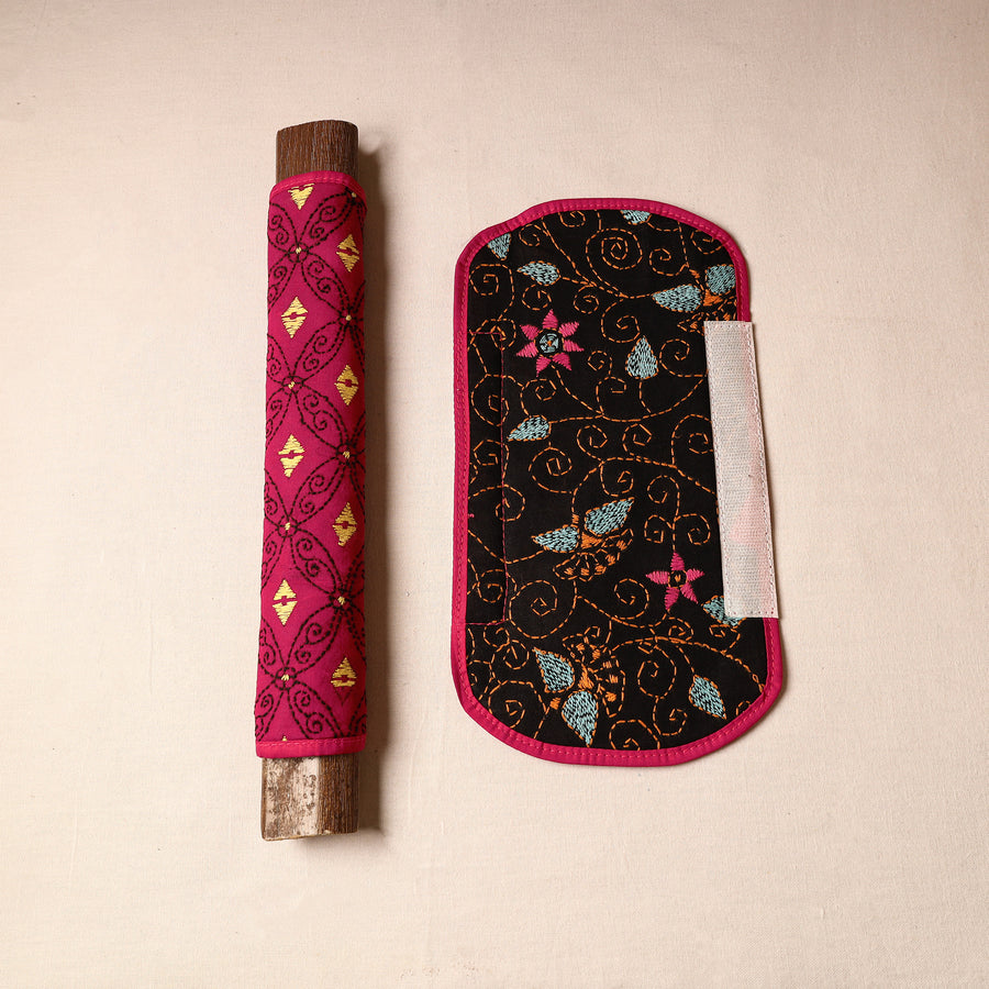 Fine quality pink Bengal kantha work reversible handmade fridge handle cover made from cotton fabric & foam. It is intricately designed with tiny running stitches in coloured thread using traditional craft technique of West Bengal .