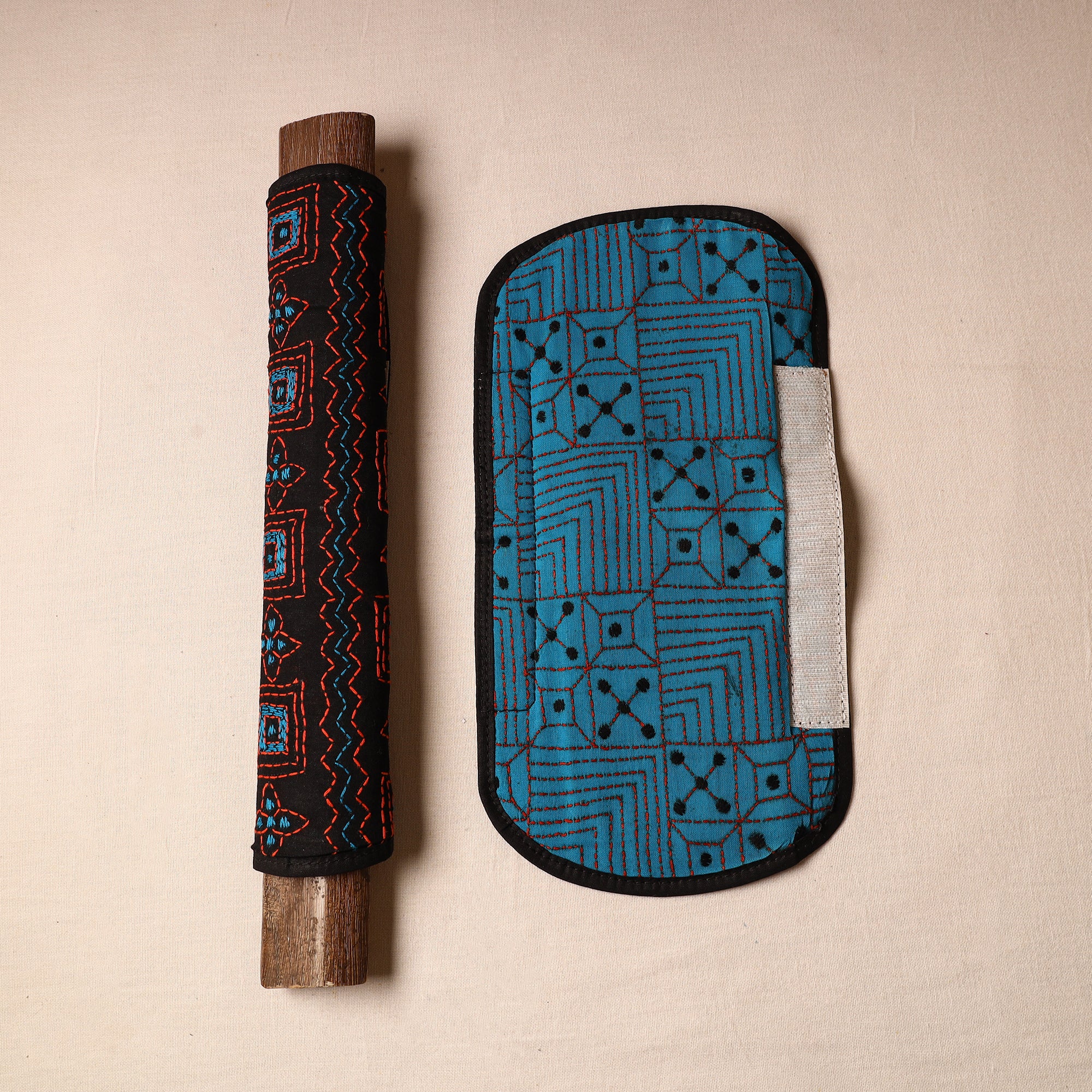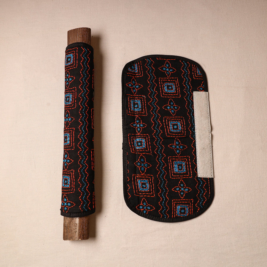 Fine quality Bengal kantha work black handmade reversible fridge handle cover made from cotton fabric & foam. It is intricately designed with tiny running stitches in coloured thread using traditional craft technique of West Bengal.