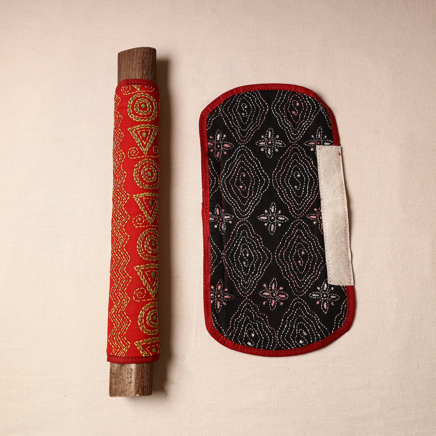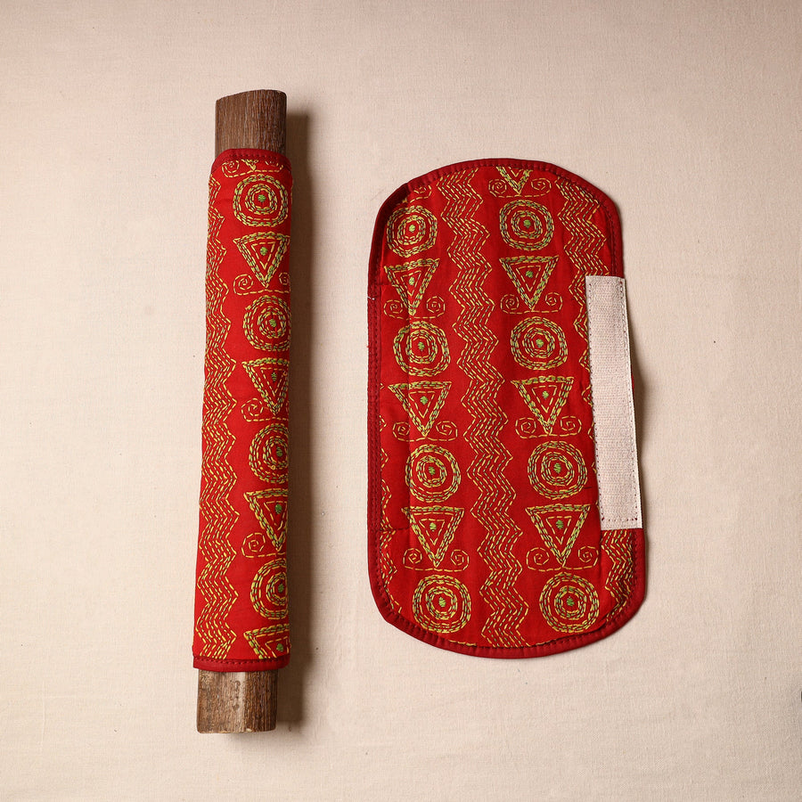Fine quality Bengal kantha work handmade reversible fridge handle cover made from cotton fabric & foam. It is intricately designed with tiny running stitches in coloured thread using traditional craft technique of West Bengal.