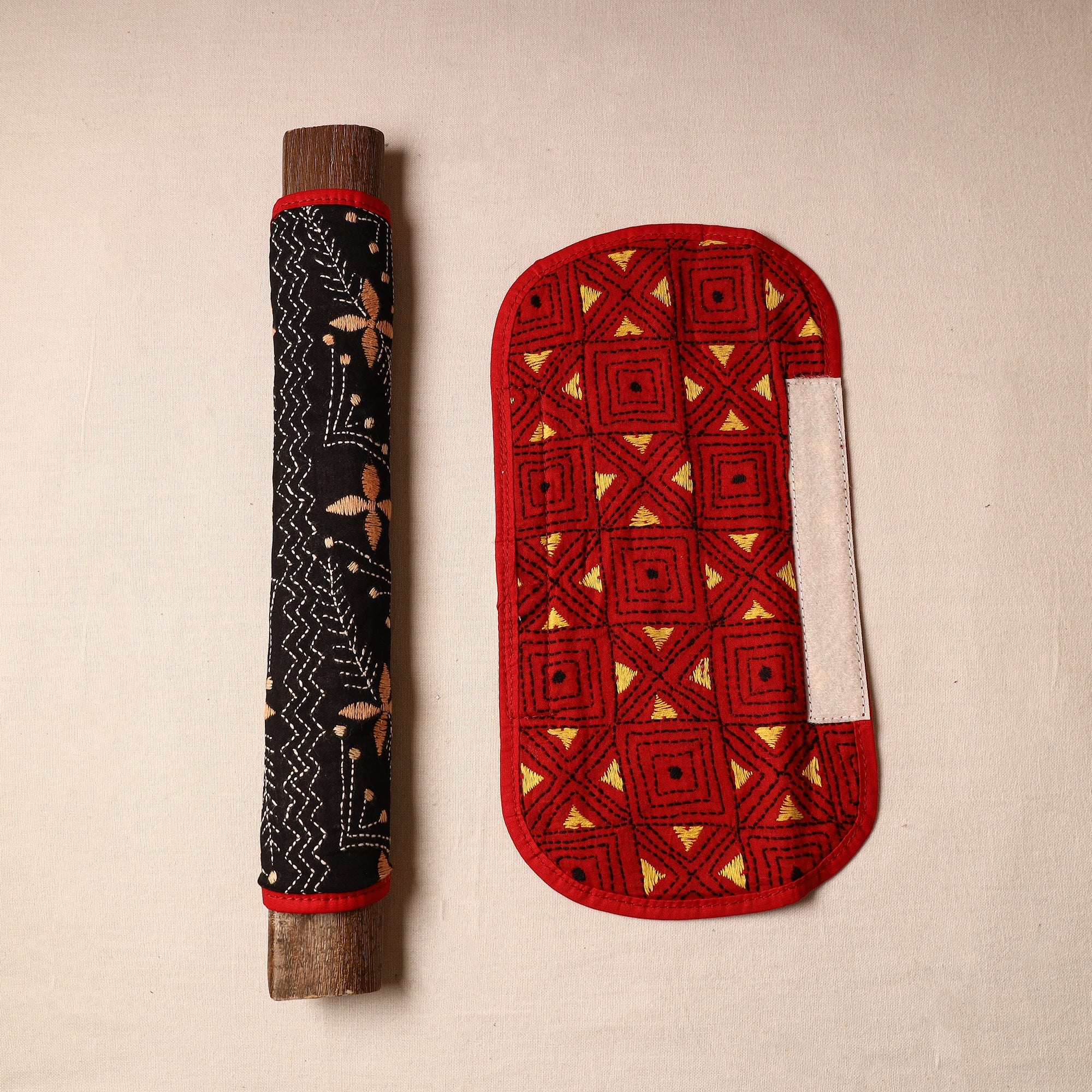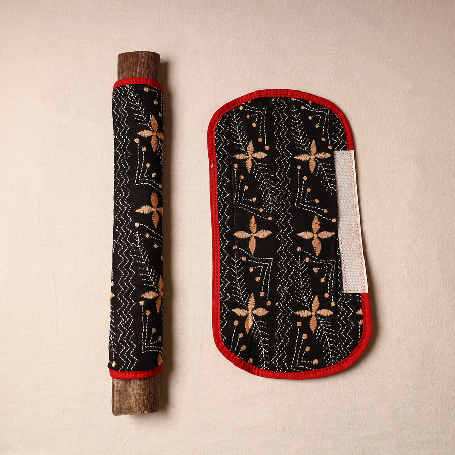 Fine quality Bengal kantha work black handmade reversible fridge handle cover made from cotton fabric & foam. It is intricately designed with tiny running stitches in coloured thread using traditional craft technique of West Bengal.