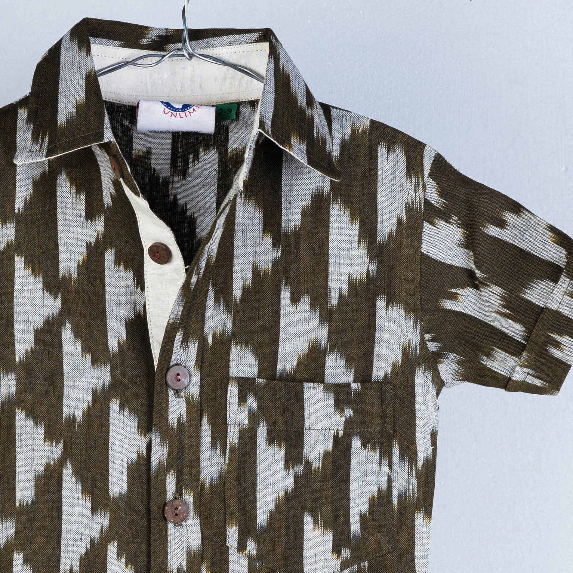 Fine quality pochampally ikat cotton kids half sleeve shirt. Ikat (Ikkat) is a dyeing technique used to pattern textiles that employs a resist dyeing process similar to tie-dye on either the warp or weft fibers prior to dyeing. Ikat has lovely patterns and are world famous for their extremely beautiful colors, texture and designs. Indian Ikat is always admired by the fashion designers around the world.