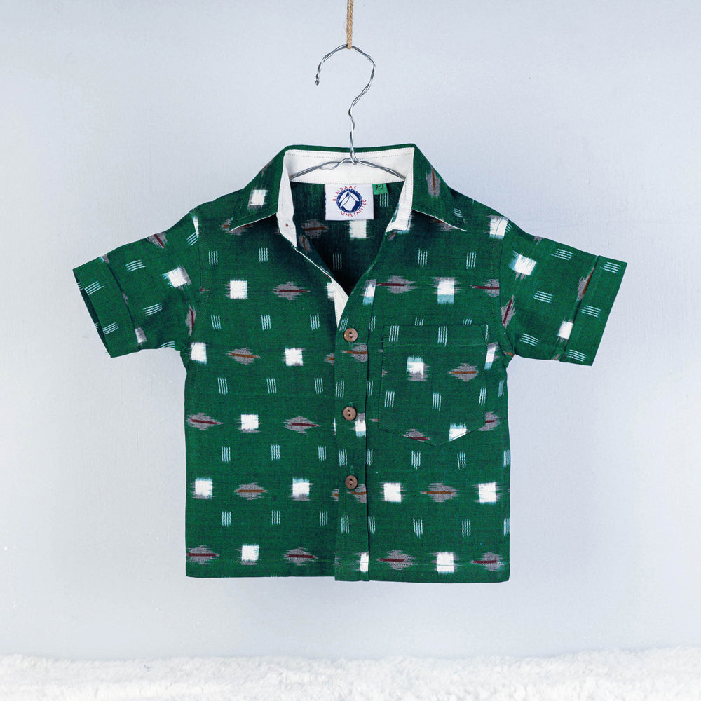Fine quality pochampally ikat cotton kids half sleeve shirt. Ikat (Ikkat) is a dyeing technique used to pattern textiles that employs a resist dyeing process similar to tie-dye on either the warp or weft fibers prior to dyeing. Ikat has lovely patterns and are world famous for their extremely beautiful colors, texture and designs. Indian Ikat is always admired by the fashion designers around the world.