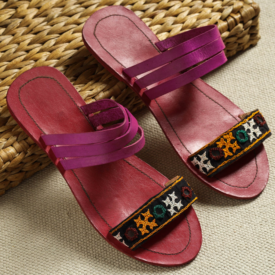 Fine purple hand-stitched soft leather slippers with kutch mirror work embroidery. These are completely hand-made with cruelty free leather used in production, the pieces of leather are hand stitched by passing thick thread through small slits made with a stitching awl. Kutch Embroidery is a handicraft and textile signature art tradition of the tribal community of kutch district in Gujarat.