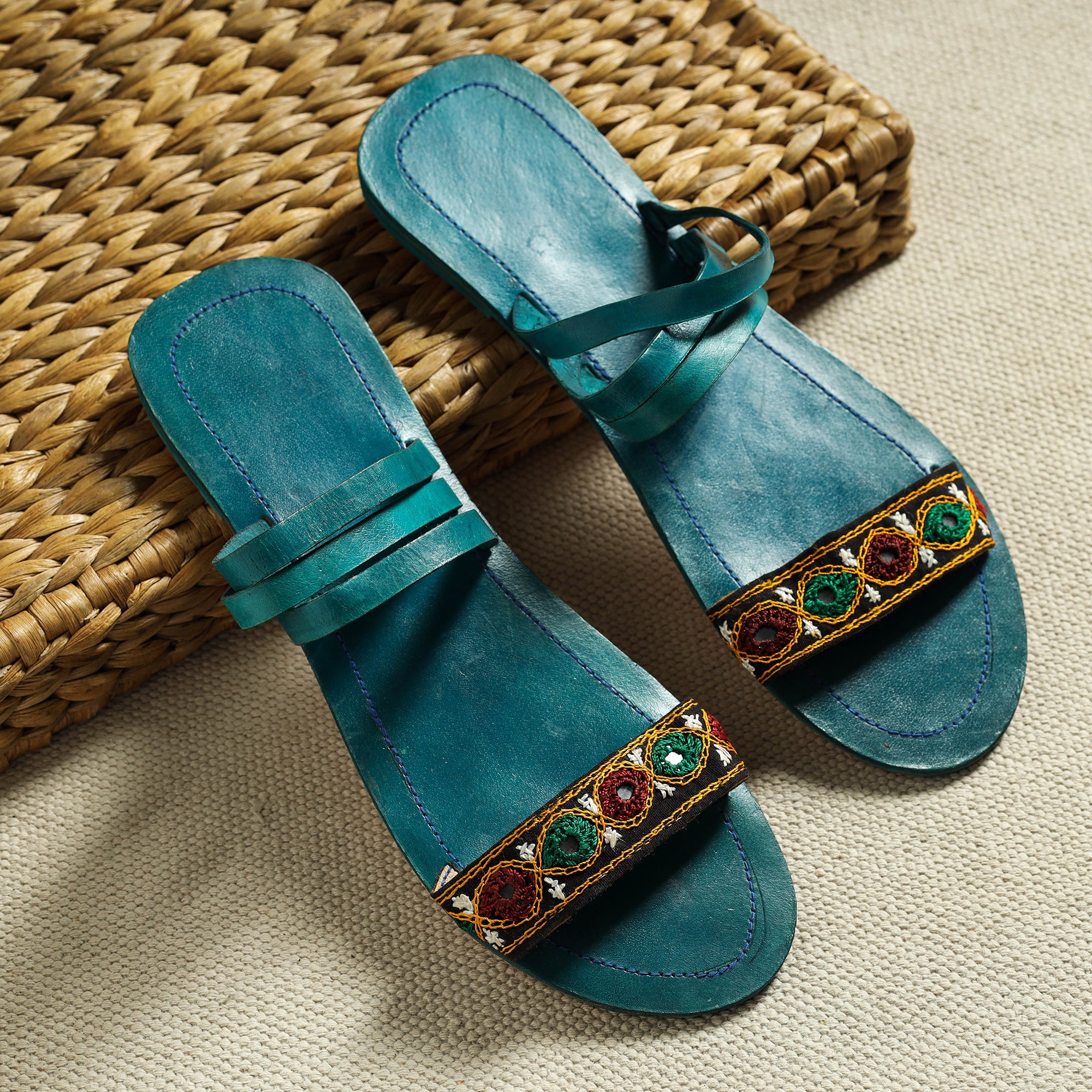 Fine green hand-stitched soft leather slippers with kutch mirror work embroidery. These are completely hand-made with cruelty free leather used in production, the pieces of leather are hand stitched by passing thick thread through small slits made with a stitching awl. Kutch Embroidery is a handicraft and textile signature art tradition of the tribal community of kutch district in Gujarat.