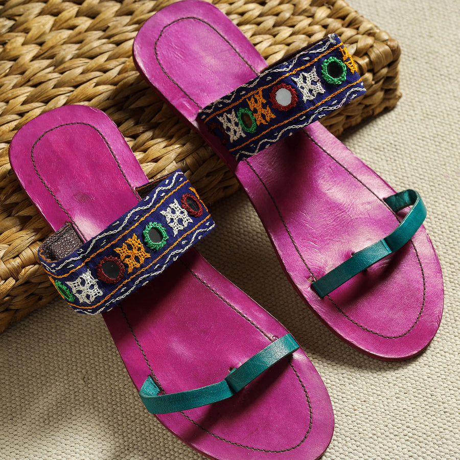 Fine purple hand-stitched soft leather slippers with kutch mirror work embroidery. These are completely hand-made with cruelty free leather used in production, the pieces of leather are hand stitched by passing thick thread through small slits made with a stitching awl. Kutch Embroidery is a handicraft and textile signature art tradition of the tribal community of kutch district in Gujarat.