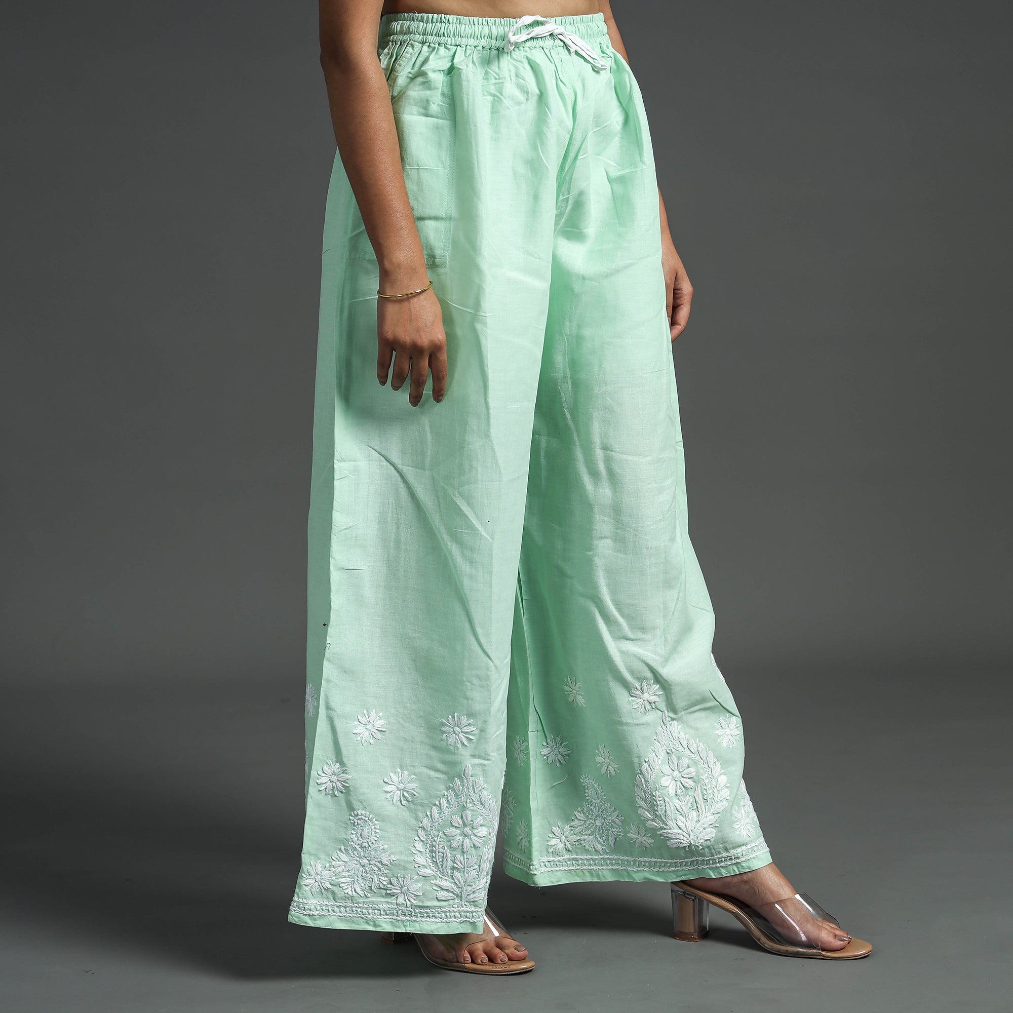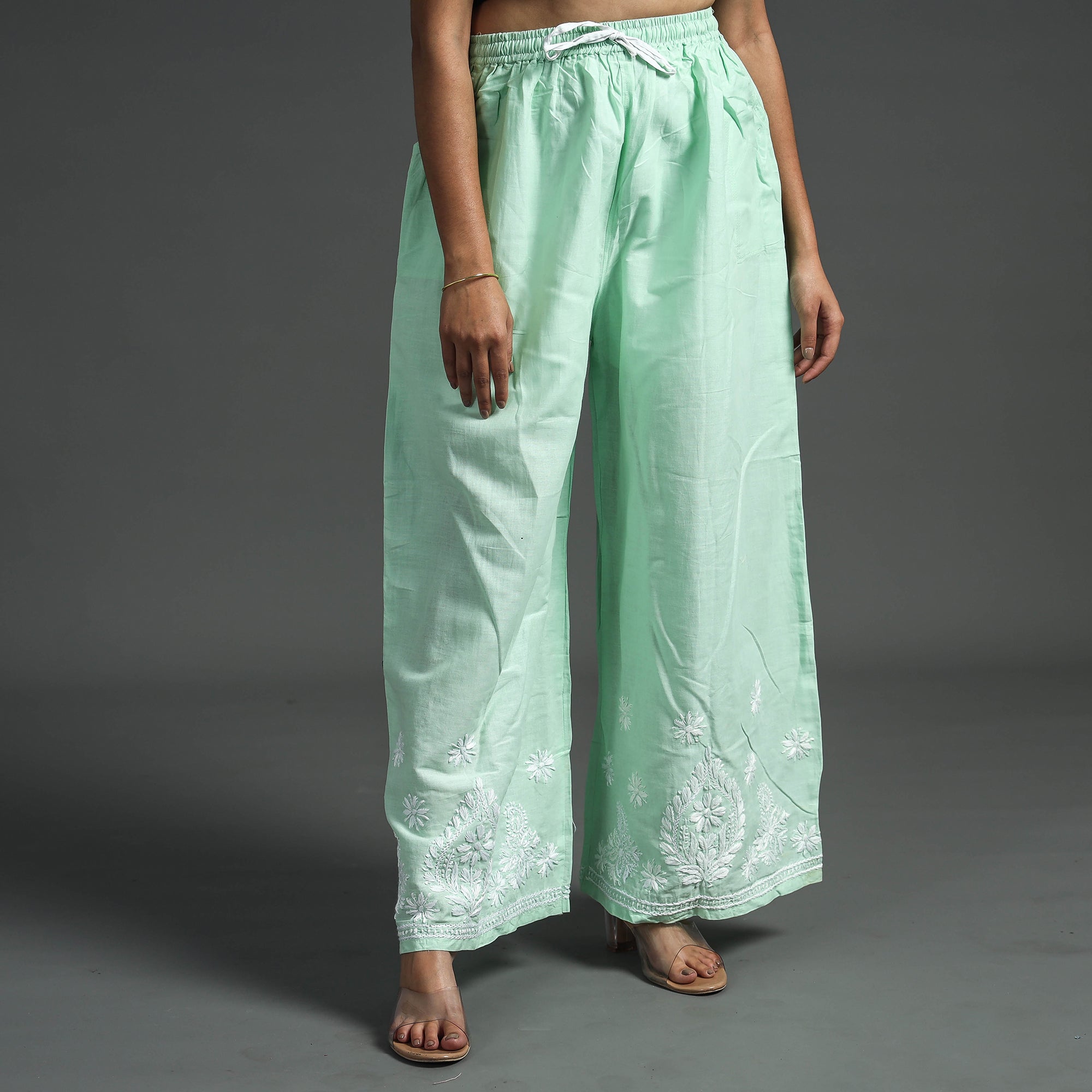 Intricate and artfully done lucknowi chikankari hand embroidered cotton palazzo. Chikankari is a traditional textile decorative from Lucknow. It is very delicate and intricate hand embroidery work where thread is embroidered on cool, pastel shades of light cotton garments.