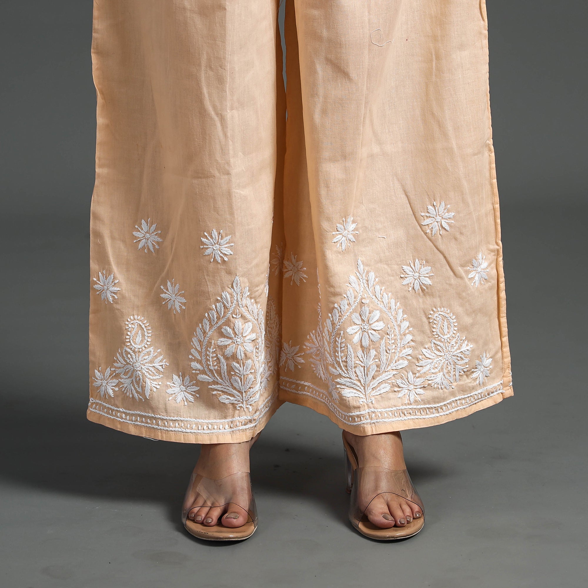 Intricate and artfully done lucknowi chikankari hand embroidered cotton palazzo. Chikankari is a traditional textile decorative from Lucknow. It is very delicate and intricate hand embroidery work where thread is embroidered on cool, pastel shades of light cotton garments.