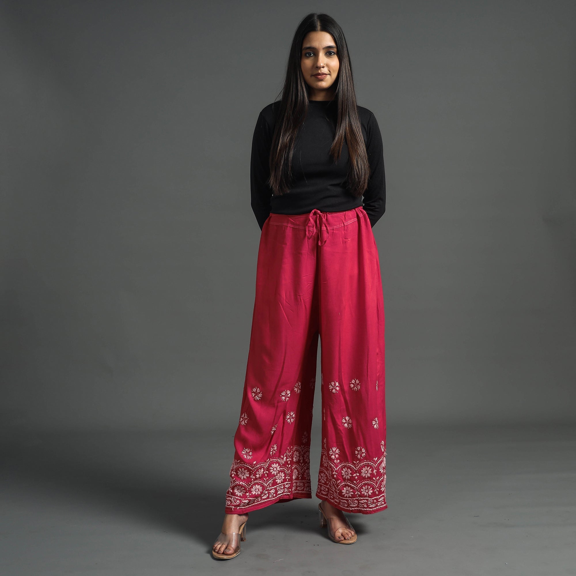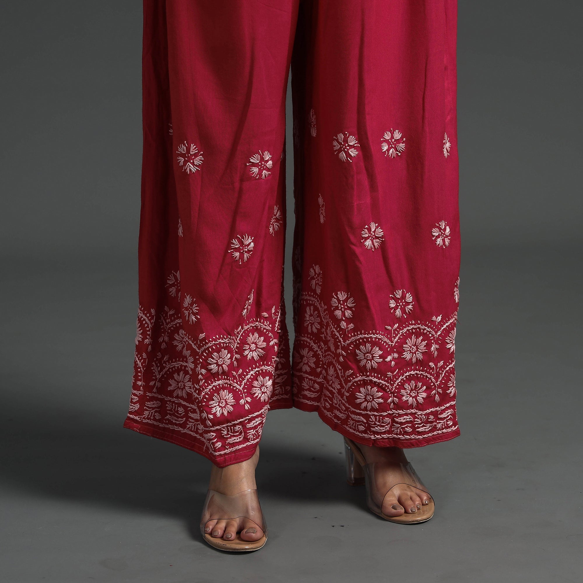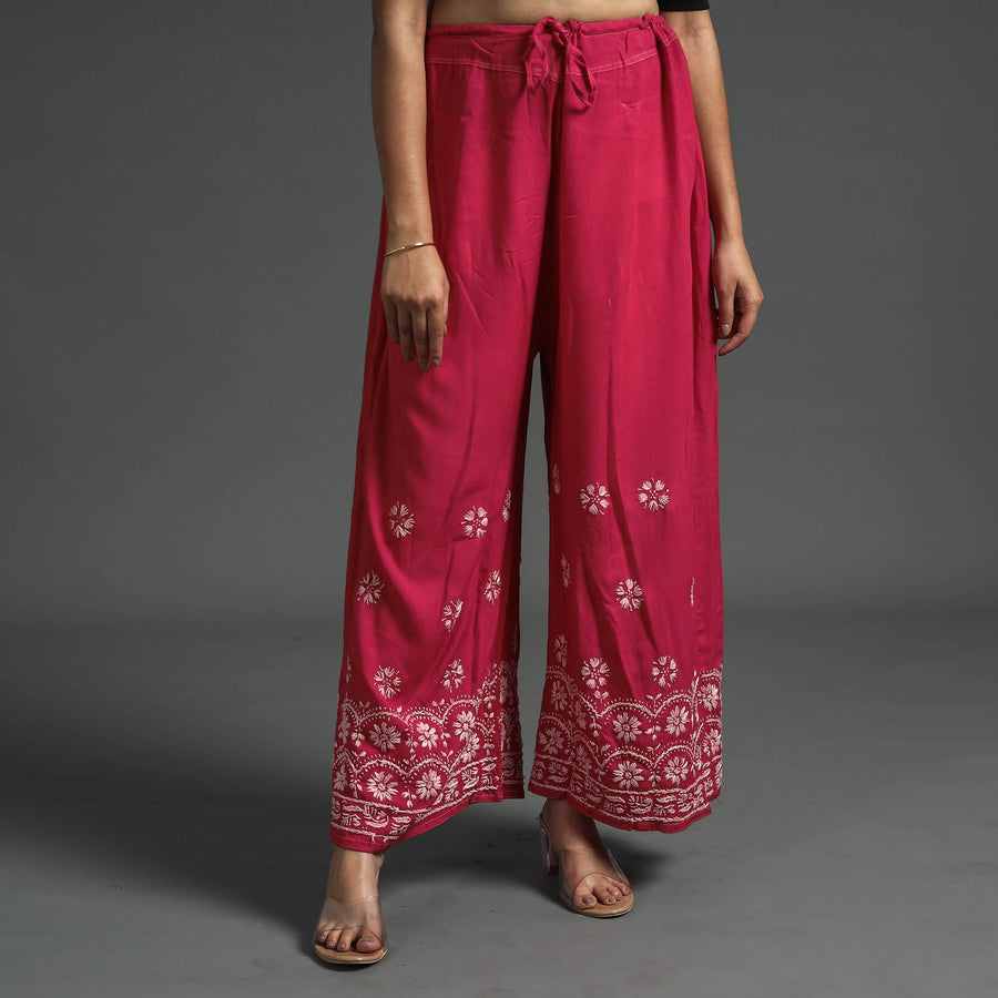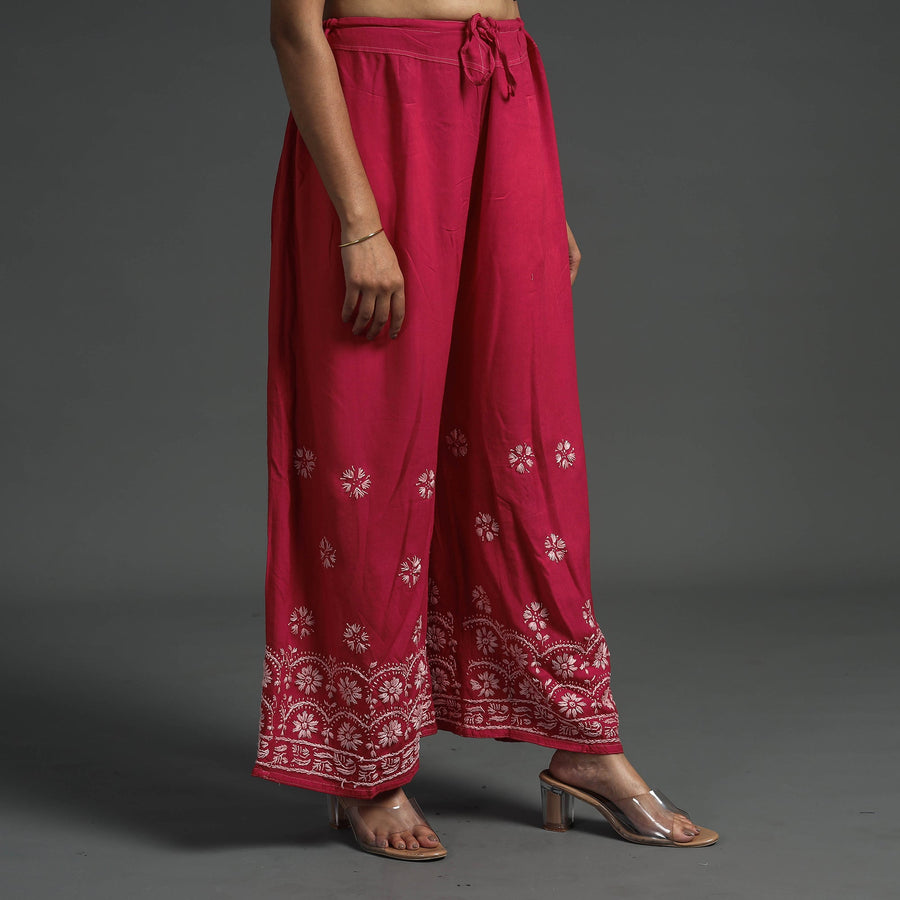 Intricate and artfully done lucknowi chikankari hand embroidered rayon-cotton palazzo. Chikankari is a traditional textile decorative from Lucknow. It is very delicate and intricate hand embroidery work where thread is embroidered on cool, pastel shades of light cotton garments.