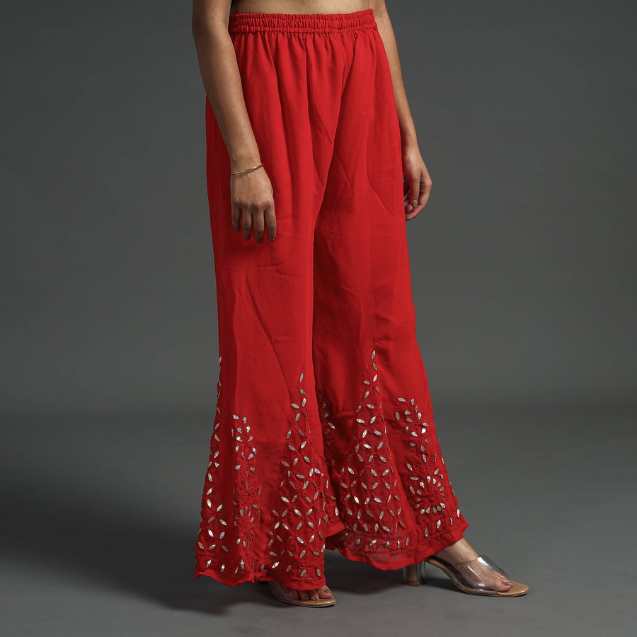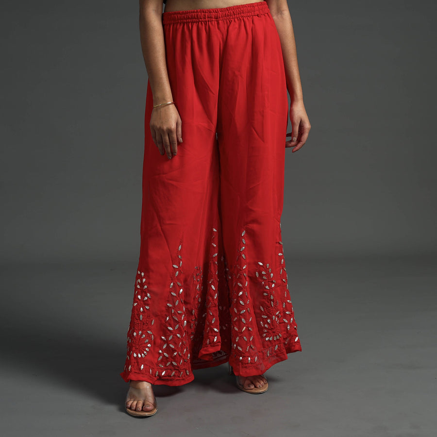 Intricate and artfully done lucknowi chikankari hand embroidered gota patti work georgette palazzo. Chikankari is a traditional textile decorative from Lucknow. It is very delicate and intricate hand embroidery work where thread is embroidered on cool, pastel shades of light cotton garments.