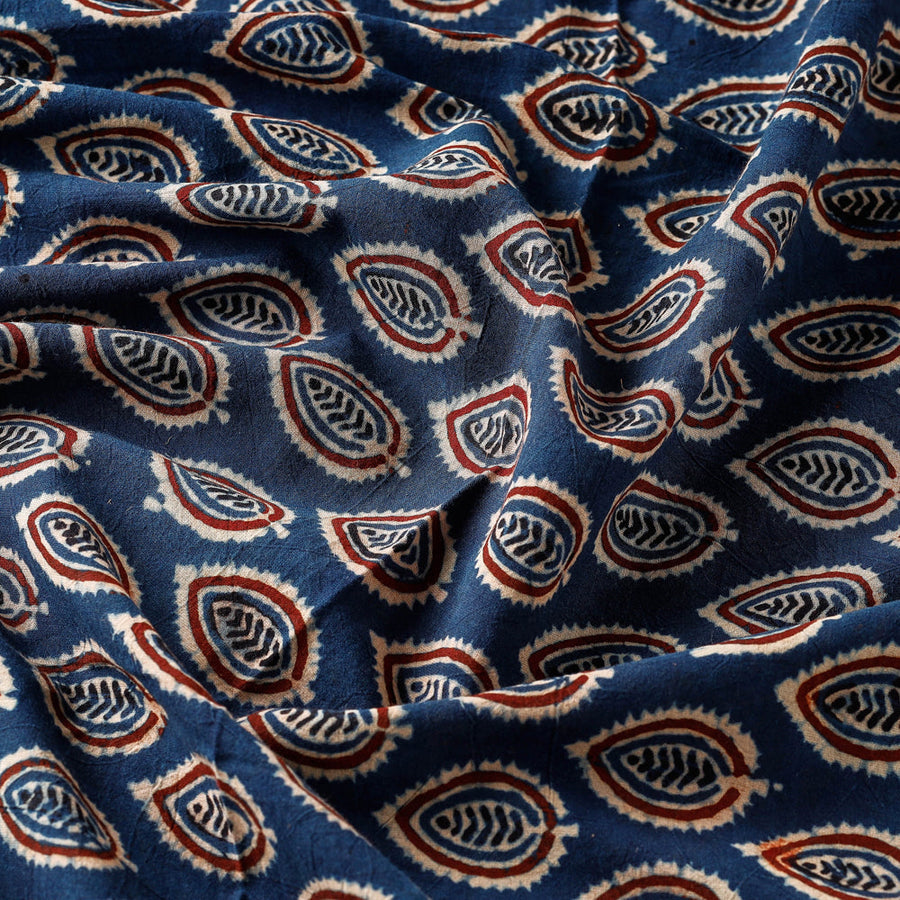 Fine quality ajrakh block printed cotton fabric made using natural dyes through traditional ajrakh technique of hand-block printing practised by the master artisans in Kutch region of Gujarat. Ajrakh is a traditional vegetable dyeing and resist block-printing technique on cloth. It is estimated to be around 4,500 years old. The Ajrakh artisans in India are originally from Sindh and they migrated to Kutch in Gujarat and Barmer in Rajasthan. Ajrakh is the traditional attire of the Maldhari pastoral community of Bhuj. The process of 'Ajrakh' is a long drawn process with many stages and each layer of colour is printed after a gap of time so the cloth has to stay for the day.