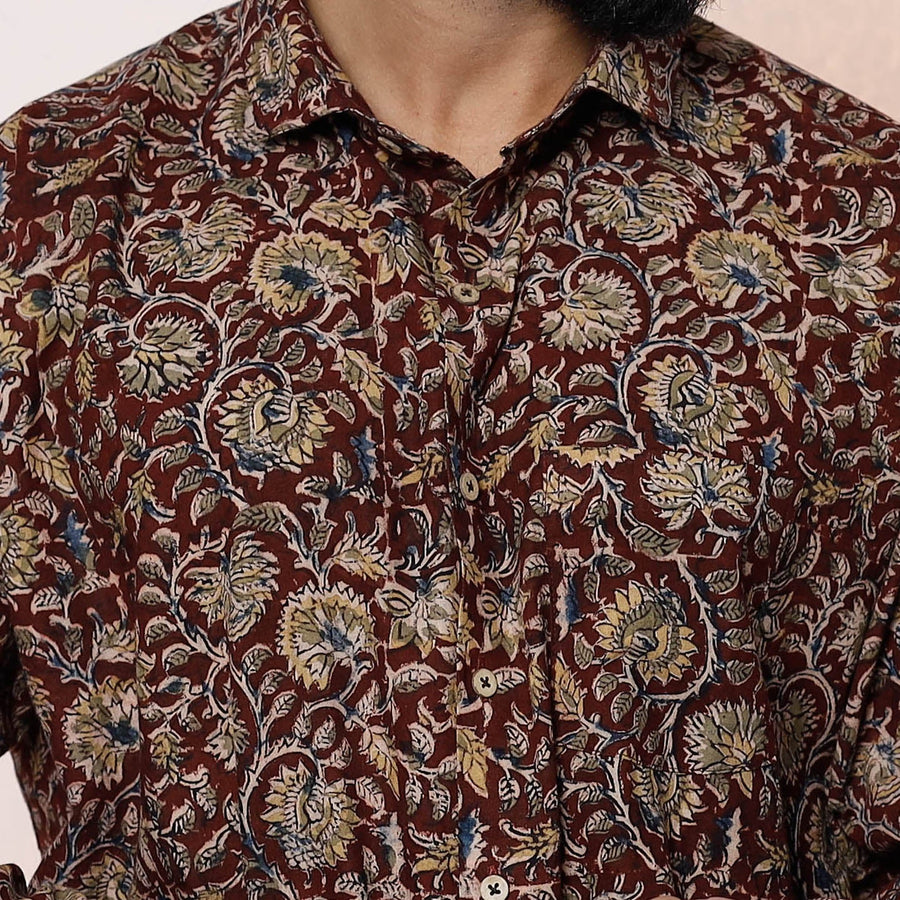Fine quality kalamkari hand block printednatural dyed pure cotton full sleeve shirt with regular collar for men. Kalamkari is the earliest and more complex techniques of block-printing. Showcasing an assortment of hand block printed motifs inspired by traditional kalamkari painting.