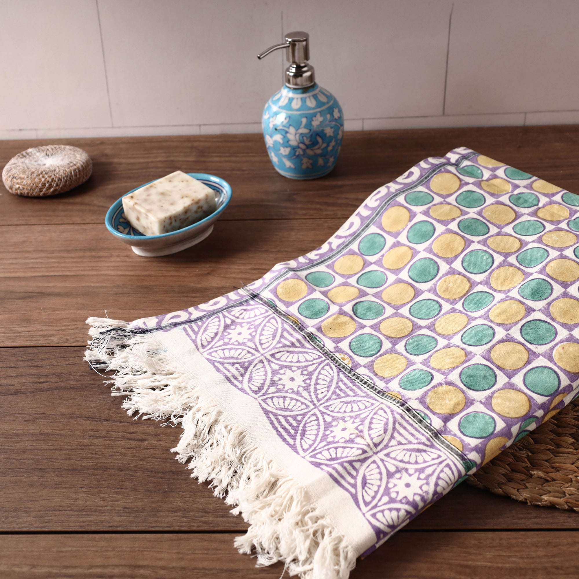 Fine quality multicolor sanganeri hand block printed pure cotton towel. Sanganeri is a hand-block printing technique originating from Sanganer, a village in the southern part of Jaipur, Rajasthan. Bleed free VAT dyes used. Pure handloom fabric woven in Jhiri, Rajasthan and fine quality block prints by Santosh Dhanopia.