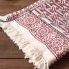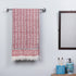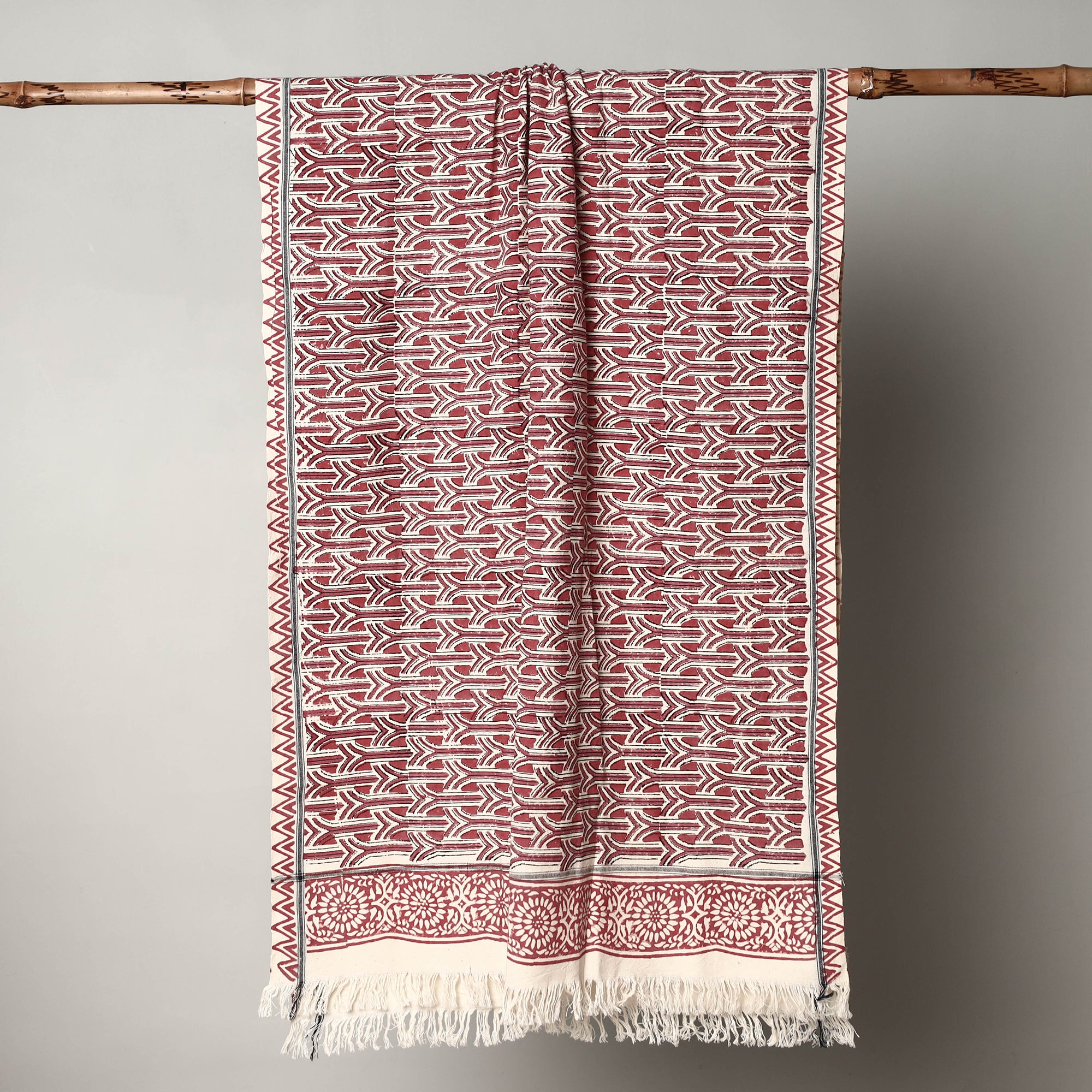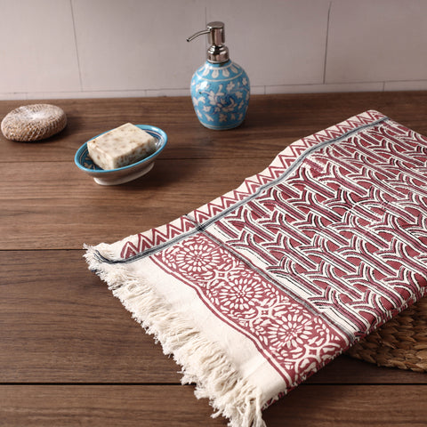 Fine quality maroon sanganeri hand block printed pure cotton towel. Sanganeri is a hand-block printing technique originating from Sanganer, a village in the southern part of Jaipur, Rajasthan. Bleed free VAT dyes used. Pure handloom fabric woven in Jhiri, Rajasthan and fine quality block prints by Santosh Dhanopia.