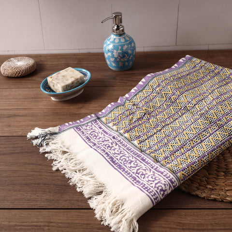 Fine quality multicolor sanganeri hand block printed pure cotton towel. Sanganeri is a hand-block printing technique originating from Sanganer, a village in the southern part of Jaipur, Rajasthan. Bleed free VAT dyes used. Pure handloom fabric woven in Jhiri, Rajasthan and fine quality block prints by Santosh Dhanopia.