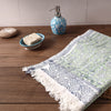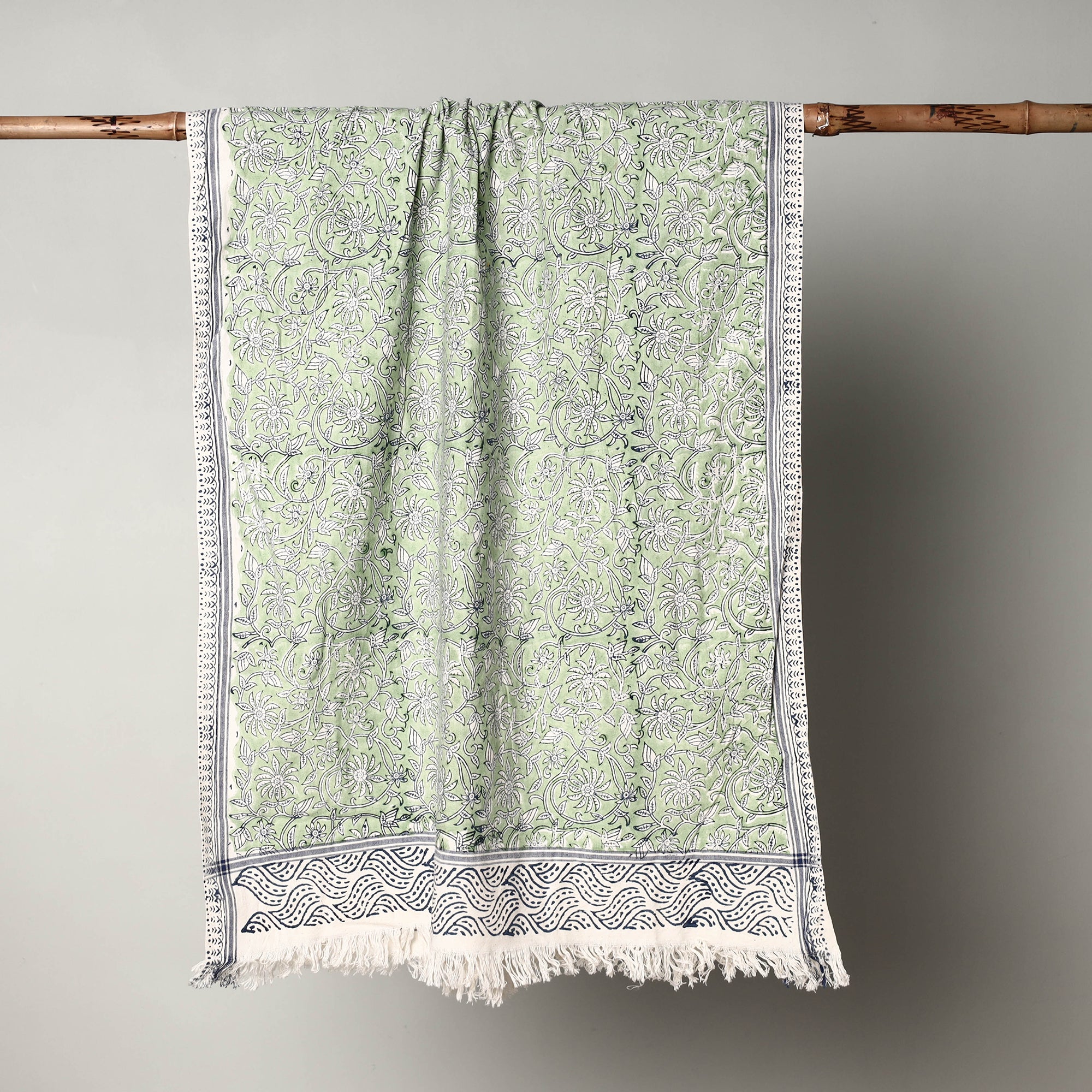 Fine quality green sanganeri hand block printed cotton towel. Sanganeri is a hand-block printing technique originating from Sanganer, a village in the southern part of Jaipur, Rajasthan. Bleed free VAT dyes used.