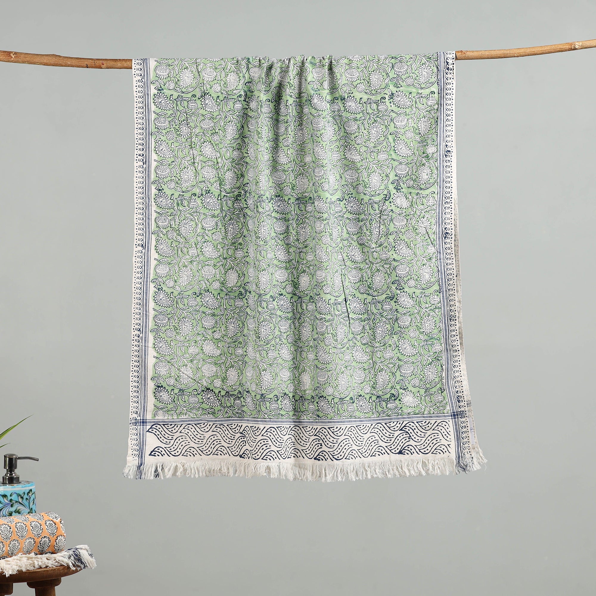 Fine quality green sanganeri hand block printed cotton towel. Sanganeri is a hand-block printing technique originating from Sanganer, a village in the southern part of Jaipur, Rajasthan. Bleed free VAT dyes used.