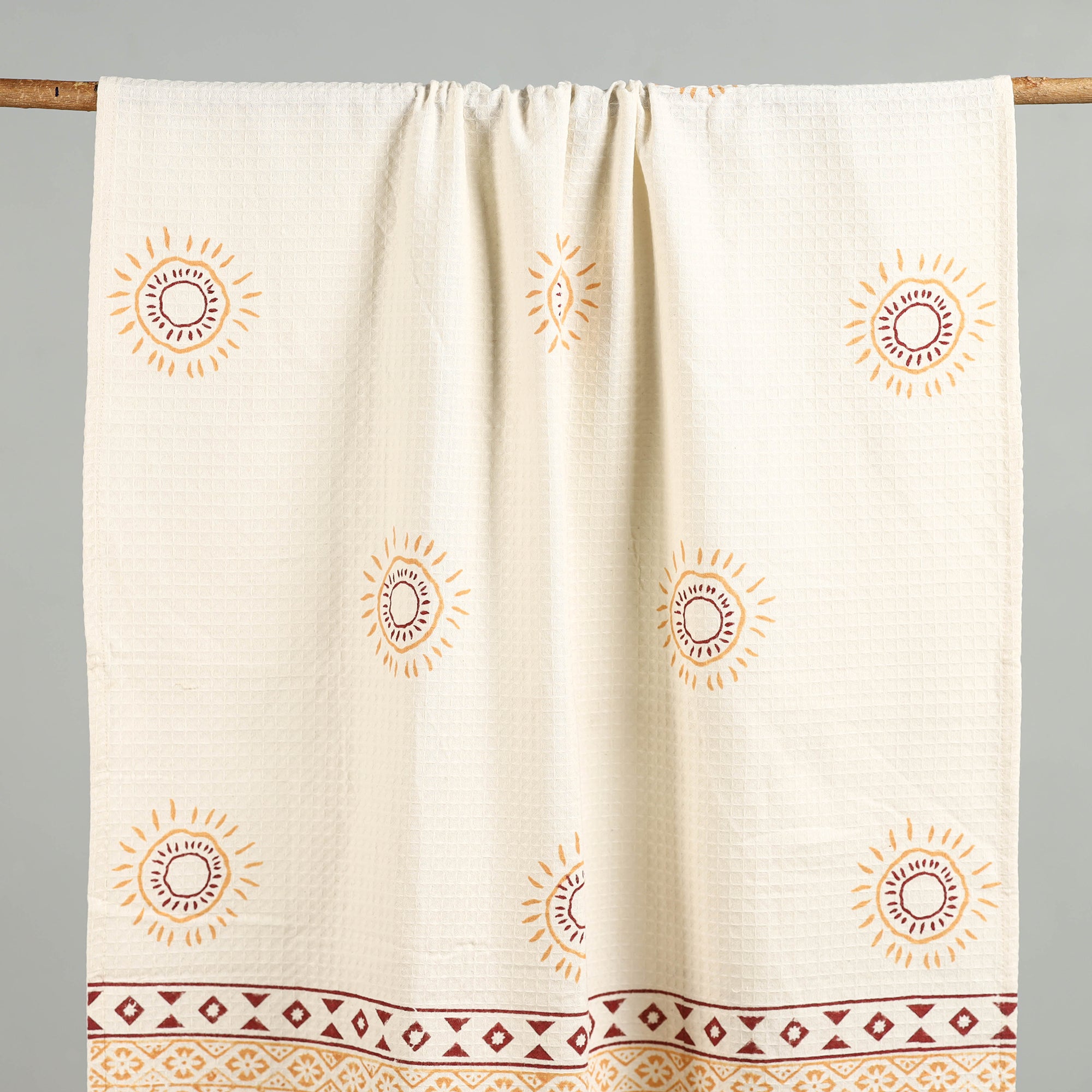 Fine quality white waffle weave sanganeri block printed pure handwoven cotton towel through traditional technique. Waffle weave is a 6 shaft texture weave which increases the water Absorbency of the fabric when applied. Soft, light yet fully absorbent.