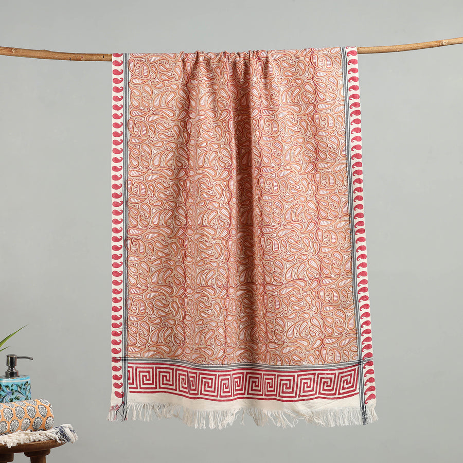 Fine quality brown sanganeri hand block printed pure cotton towel. Sanganeri is a hand-block printing technique originating from Sanganer, a village in the southern part of Jaipur, Rajasthan. Bleed free VAT dyes used. Pure handloom fabric woven in Jhiri, Rajasthan and fine quality block prints by Santosh Dhanopia.